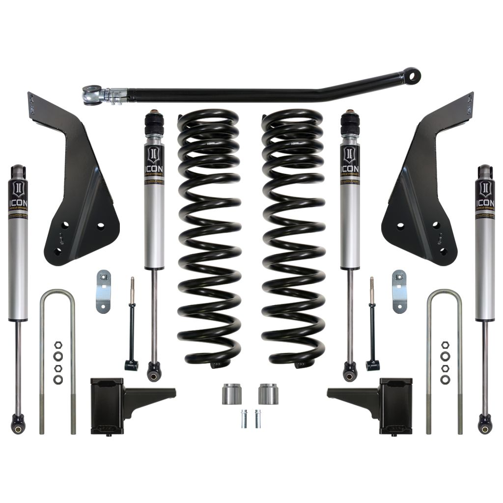 This 4.5" System for the 2005-2007 Super Duty is one the best riding suspension systems ICON has ever developed. This system has been engineered using the highest quality materials and components. The Dual-Rate front coil springs combined with our ICON 2.0 Aluminum Series shocks give these trucks the performance they so desperately need. This system comes complete with front coils, shocks, radius arm drop down brackets, rear blocks and u-bolts and our patented Adjustable Track bar giving the front end of these trucks perfect track alignment.