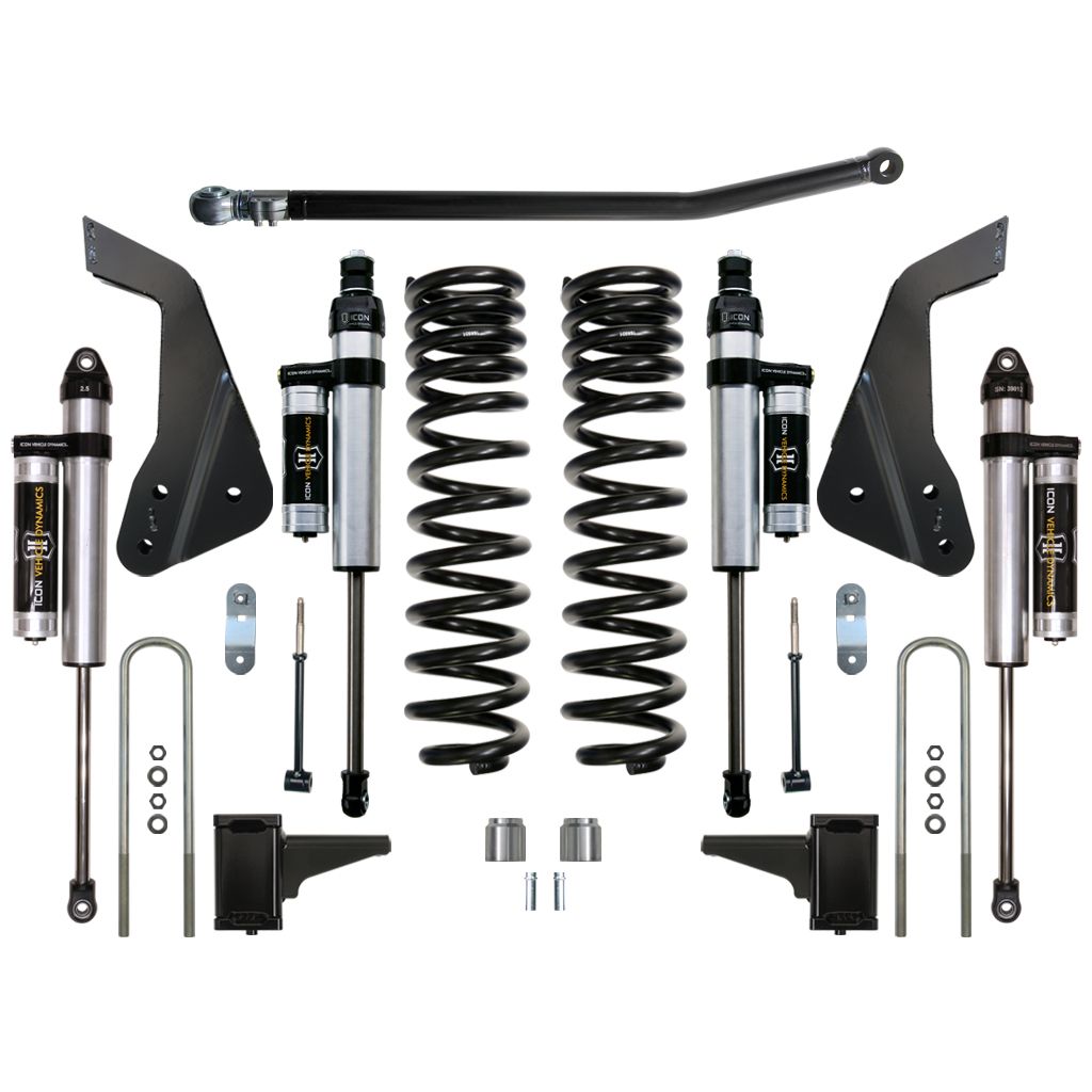 This 4.5" System for the 2005-2007 Super Duty is one the best riding suspension systems ICON has ever developed. This system has been engineered using the highest quality materials and components. The Dual-Rate front coil springs combined with our ICON 2.5 Aluminum Series piggyback reservoir shocks give these trucks the performance they so desperately need. This system comes complete with front coils, shocks, radius arm drop down brackets, rear blocks and U-bolts and our patented adjustable track bar giving the front end of these trucks perfect track alignment.