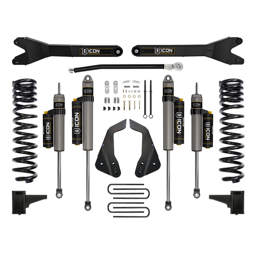 This Stage 4 system sees the inclusion of the ICON Vehicle Dynamics Ford Super Duty Radius Arm System that feature a sealed pivot bushing that minimizes road feedback and ensures a long life and quiet operation. Additionally, their fabricated, fully boxed design ensures strength and utilizes a profile optimized for tire clearance at full steering lock, making a 37” tall tire clear without coming in contact with the radius arm.
