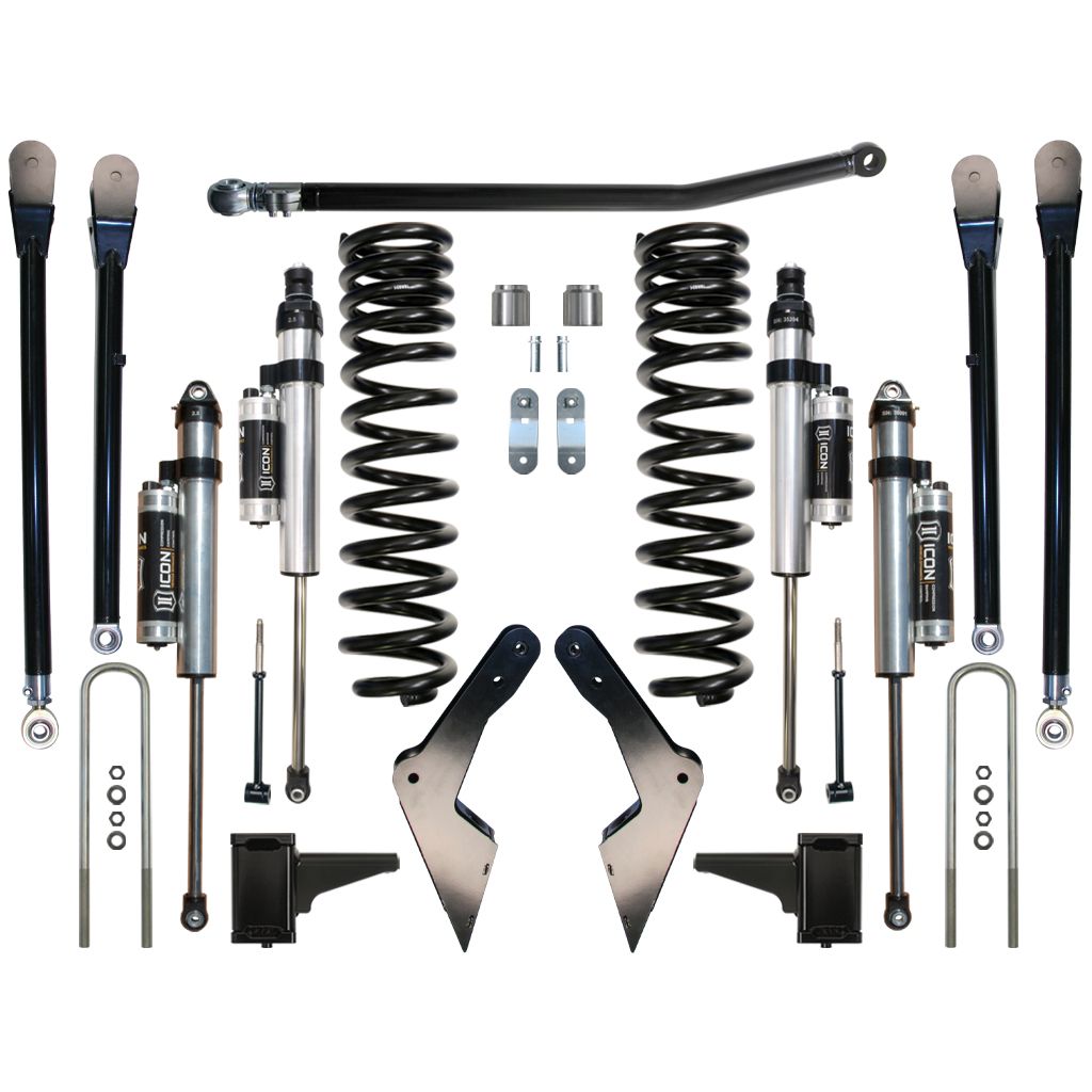 This 4.5" System for the 2005-2007 Super Duty is one the best riding suspension systems ICON has ever developed. This system has been engineered using the highest quality materials and components. The Dual-Rate front coil springs combined with our ICON 2.5 Aluminum Series shocks give these trucks the performance they so desperately need. This system comes complete with front coils, shocks, radius arm drop down brackets, rear blocks and u-bolts and our patented adjustable track bar giving the front end of these trucks perfect track alignment. The Stage 4 system also includes our 4-Link kit for the ultimate in shock technology and suspension technology.