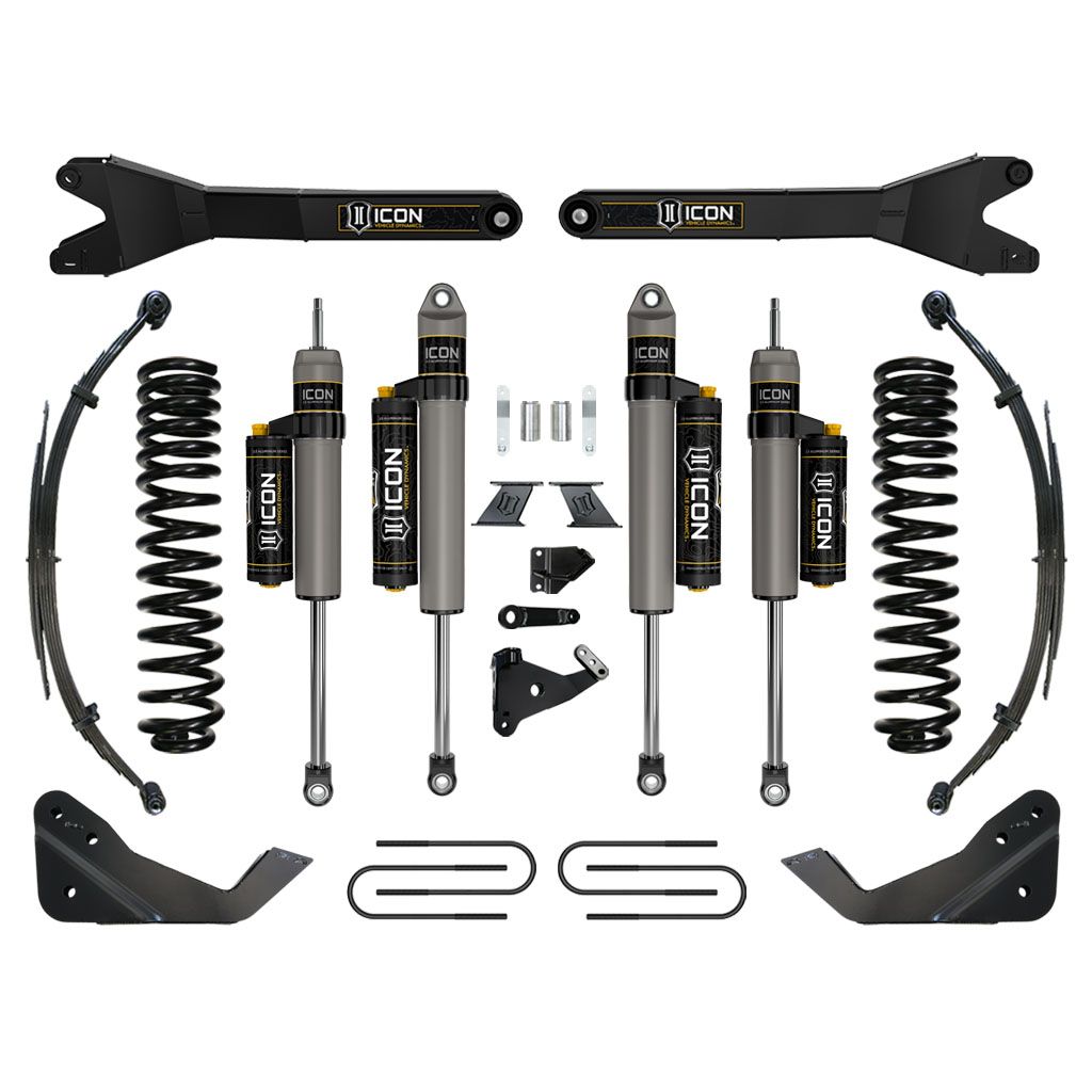 This Stage 5 system sees the inclusion of the ICON Vehicle Dynamics Ford Super Duty Radius Arm System that feature a sealed pivot bushing that minimizes road feedback and ensures a long life and quiet operation. Additionally, their fabricated, fully boxed design ensures strength and utilizes a profile optimized for tire clearance at full steering lock, making a 37” tall tire clear without coming in contact with the radius arm.