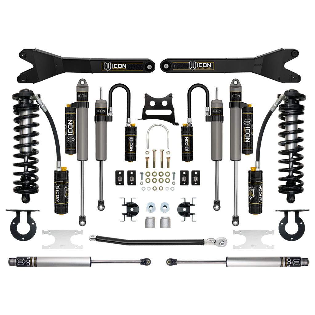 This Stage 6 system sees the inclusion of the ICON Vehicle Dynamics Ford Super Duty Radius Arm System that feature a sealed pivot bushing that minimizes road feedback and ensures a long life and quiet operation. Their on vehicle caster adjustment allows for proper caster while eliminating the need for caster bushings or drop brackets. Additionally, their fabricated, fully boxed design ensures strength and utilizes a profile optimized for tire clearance at full steering lock, making a 37” tall tire clear without coming in contact with the radius arm.