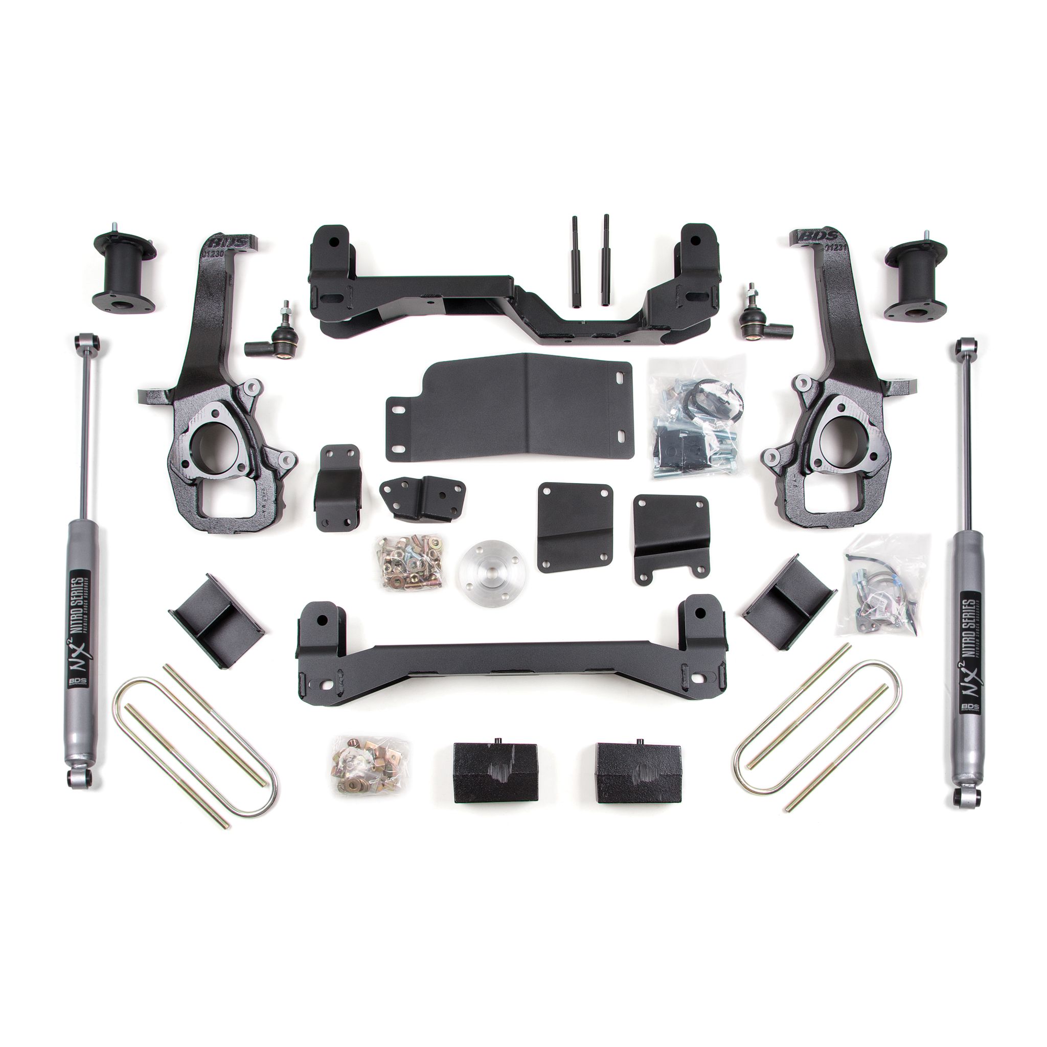 <p>This kit takes advantage of BDS's tried and true high-clearance design for improved ground clearance, strength, and offroad protection while correcting suspension and steering geometry for great on-road handling characteristics. Up front, the kit utilizes top mounted strut spacers, high-arched 1/4-inch thick steel crossmembers along with a multipiece differential relocation brackets and heavy duty skid plates built for offroad protection. Steering geometry is corrected at the new taller ride height with CNC-machined ductile iron steering knuckles and replacement tie rod ends allowing for ESC system compatibility. These combined with the provided sway bar drops, bump stop extensions, stainless steel braided brake lines, CV spacers, supplied hardware and more provide a comprehensive front suspension lift ready for whatever you throw at it.</p>