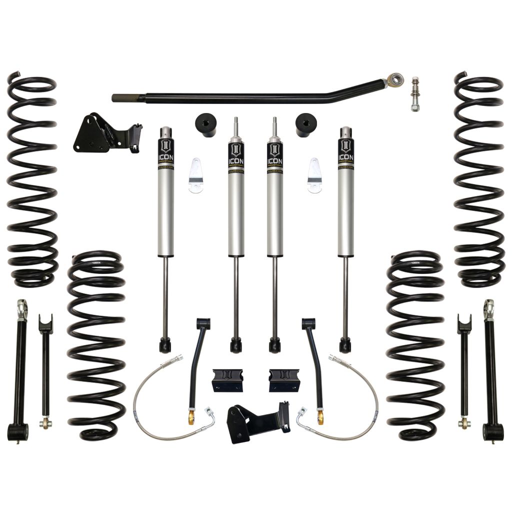The ICON Stage 1 Jeep JK 4.5" suspension system includes dual-rate coil springs, track bar drop brackets, high-steering components, bumps top spacers, rear brake lines, rear sway bar links, adjustable front upper and rear lower links, and 2.0 Aluminum Series IFP shocks. Tested and tuned, the ICON JK Stage 1 suspension system offers stability and drivability over a wide range of off-road terrains, while keeping a smooth on road feel for every day driving. Installing this kit allows proper clearance for 35" tall tires with no modifications and 37" tires with aftermarket high clearance fenders.