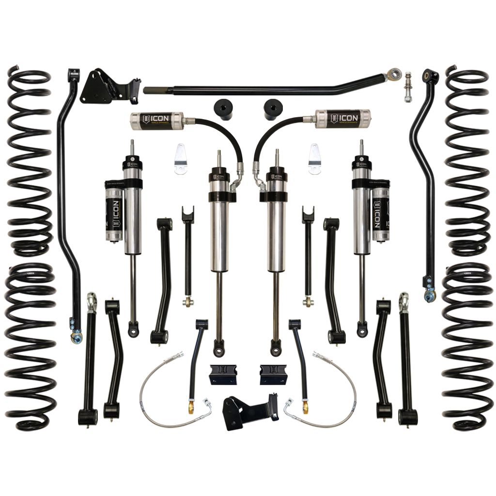 The ICON Stage 3 Jeep JK 4.5" suspension system includes dual-rate coil springs, track bar drop brackets, high-steering components, bump stop spacers, rear brake lines, rear sway bar links, complete set of front and rear links, and 2.5 Series reservoir shocks. Tested and tuned, the ICON JK Stage 3 suspension system offers stability and drivability over a wide range of off-road terrains, while keeping a smooth on road feel for every day driving. This system includes 2.5" remote reservoir shocks front and rear to ensure optimum performance by increasing the duration of consistent damping regardless of situation, keeping the shocks at a cooler operating temperature during heavy use. Installing this kit allows proper clearance for 35" tall tires with no modifications and 37" tires with aftermarket high clearance fenders.