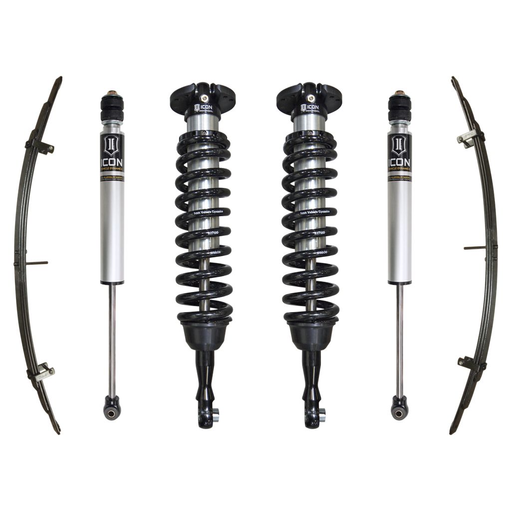 ICON Vehicle Dynamics Toyota Tundra Stage 2 suspension systems are designed with maximum performance and the serious driver in mind. ICON engineers’ primary focus is to increase wheel travel and damping ability, which translates into outstanding vehicle control and ride quality both on and off-road. The Stage 2 system includes vehicle-specific tuned 2.5” coilover shocks featuring an internal reservoir for exceptional cooling properties. These coilovers are also height adjustable from 1-3” of lift allowing the use of larger, more aggressive wheel and tire combinations. ICON 2.0 VS Aluminum Series monotube rear shocks utilize a vehicle-specific valving and then when combined with ICON's expansion pack give you the performance of the truck from front to rear. The ICON Vehicle Dynamics 2007-2021 Toyota Tundra Stage 2 suspension system is an excellent choice for those drivers looking to enhance the capabilities of their pickup on the road as well as in the dirt.