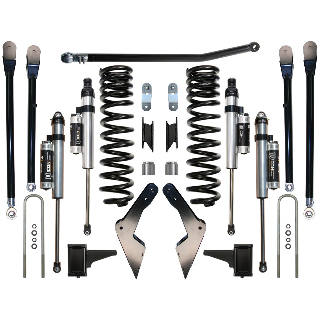 This 4.5" System for the 2008-2010 Super Duty is one the best riding suspension systems ICON has ever developed. This system has been engineered using the highest quality materials and components. The dual rate front coil springs combined with our ICON 2.5 Aluminum Series CDCV shocks give these trucks the performance they so desperately need. This system comes complete with front coils, shocks, radius arm drop down brackets, rear blocks and U-bolts and our patented adjustable track bar giving the front end of these trucks perfect track alignment. The Stage 4 system also includes shocks that feature the ICON Compression Damping Control Valve (CDCV) and our 4-Link kit for the ultimate in shock technology and suspension technology.