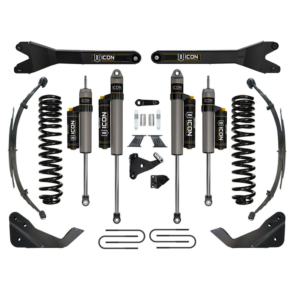 This Stage 4 system sees the inclusion of the ICON Vehicle Dynamics Ford Super Duty Radius Arm System that feature a sealed pivot bushing that minimizes road feedback and ensures a long life and quiet operation. Additionally, their fabricated, fully boxed design ensures strength and utilizes a profile optimized for tire clearance at full steering lock, making a 37” tall tire clear without coming in contact with the radius arm.