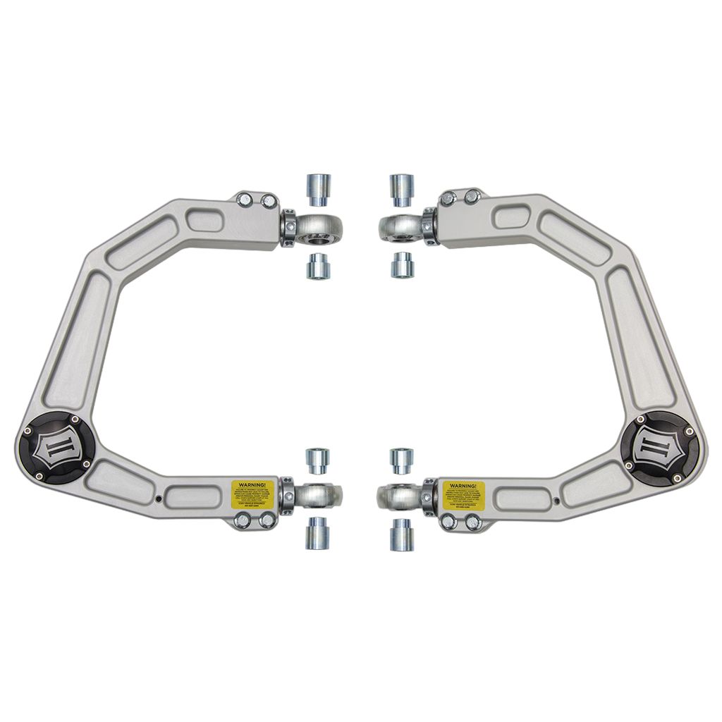 These upper control arms feature ICON's patented Delta Joint. The Delta Joint is a heavy duty high angle ball joint that combines the durability of a ball joint with the performance characteristics of a traditional uniball. While the industry standard uniball does a great job of allowing the control arms of a vehicle to articulate with little bind, they do have an inherent weakness that leaves more to be desired when used in a daily driven application – exposure to the elements. The Delta Joint features a zinc plated housing providing the first layer of corrosion resistance, while a tough grease seal keeps potentially harmful elements out of the inner workings of the joint. Metal on metal construction and a greasable design increase the longevity of the Delta Joint while at the same time allowing for noise-free operation. What makes the Delta Joint unique is that it brings the best of both worlds to ICON upper control arms with features that make it more robust than a uniball, and at the same time capable of greater angularity than a typical ball joint.