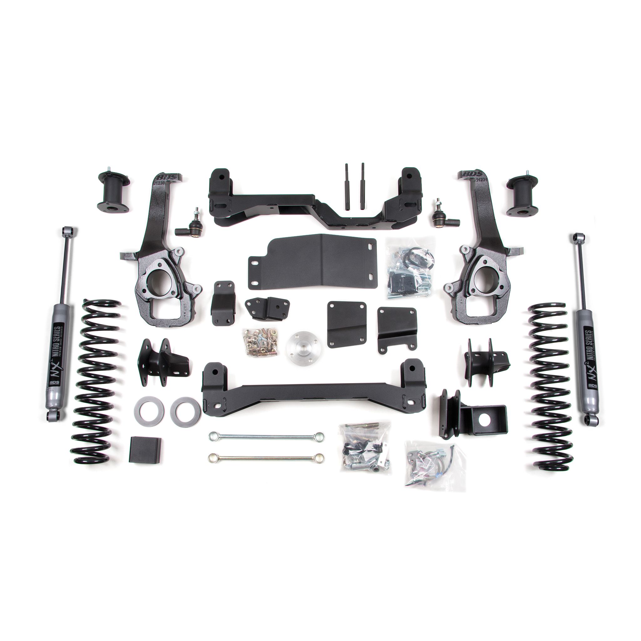 <p>This kit takes advantage of BDS's tried and true high-clearance design for improved ground clearance, strength, and offroad protection while correcting suspension and steering geometry for great on-road handling characteristics. Up front, the kit utilizes top mounted strut spacers, high-arched 1/4-inch thick steel crossmembers along with a multipiece differential relocation brackets and heavy duty skid plates built for offroad protection. Steering geometry is corrected at the new taller ride height with CNC-machined ductile iron steering knuckles and replacement tie rod ends allowing for ESC system compatibility. These combined with the provided sway bar drops, bump stop extensions, stainless steel braided brake lines, CV spacers, supplied hardware and more provide a comprehensive front suspension lift ready for whatever you throw at it.</p>