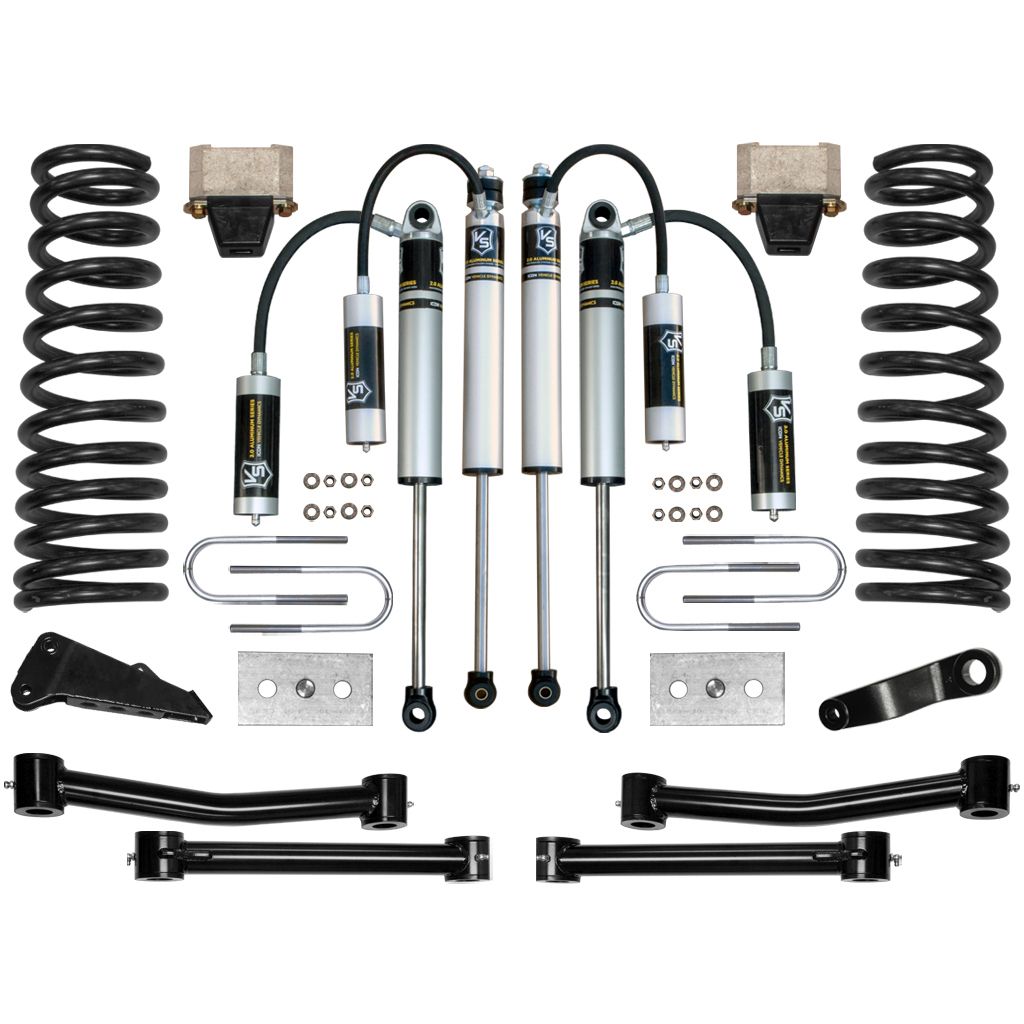 2009-2012 Ram 2500/3500 4.5" Stage 2 Suspension System utilizes the same technology as the 2.5" systems while adding lift height and ground clearance. Additional engineered front-end components are added to ensure proper steering geometry with improved function throughout the entire travel range whether on or off road. The Stage 2 System is comprised of dual rate coil springs, tubular steel upper & lower link arms, polyurethane bump stops w/ billet extension, sway bar drop brackets, forged pitman arm, track bar drop bracket, rear 2.5" lift blocks with U-bolts, and 2.0 Aluminum Series remote reservoir shocks. Remote reservoir shocks will extend performance of the kit by increasing the duration of consistent damping regardless of situation. ICON steel upper & lower links increase performance, strength, and range of alignment. These link arms decrease the bind found in the factory link bushings. This performance system with link arms is great for towing, rough construction site terrains, and country dirt roads all while keeping a smooth highway feel. Installing this kit allows proper clearance for 35" tall tires with no modifications, and some 37" tires with minor fender well trimming for clearance. With the endless hours ICON has spent testing and tuning our suspension components and shocks together, you can rest assured you have the best suspension solution on the market.
