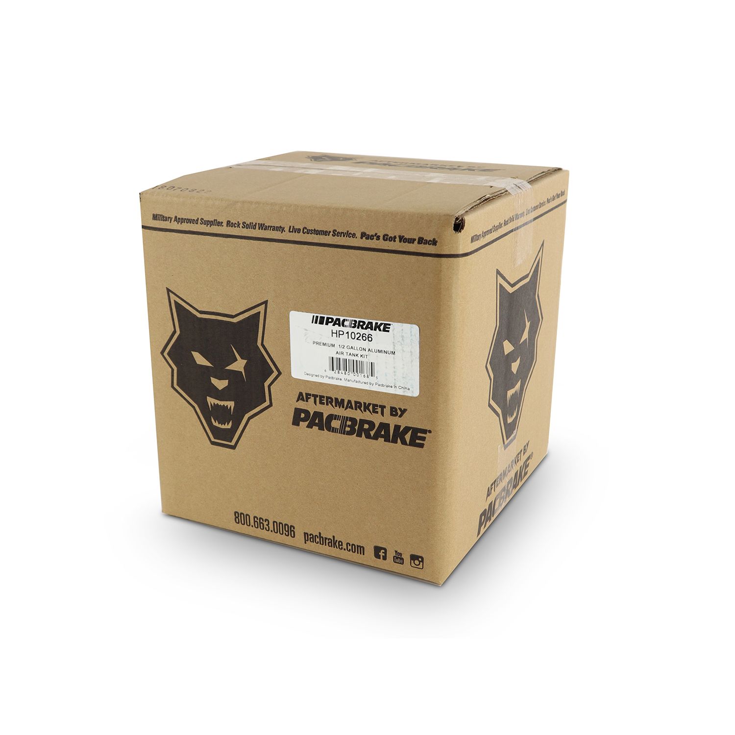 air accessories. Fittings. Fasteners and more. Air Tank Specifications: (Part Number HP10257) 2 x (-4) NPT ports. Rust Inhibitor applied to inside of tank. Max Working Pressure of 200 psi. Size is 8.4 x 5.9 x 7.1(LxWxH). Weighs 1.98 lbs. Welded on Mounting Brackets. Details: Application Universal. Material Aluminum. Capacity .5 Gallon. Pacbrake Series.