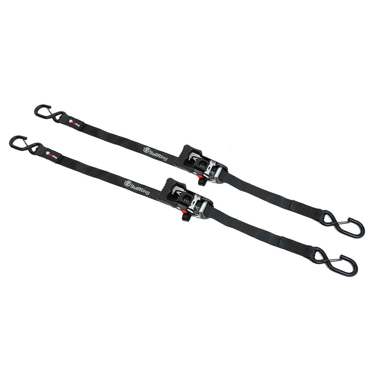 BullRing’s 1.25? x 12’ Sliding Ratchet Tie Downs make securing cargo on your truck or trailer quick and easy. A common issue with ratchet straps can be hard to access and tighten. Think of the last time you tried to ratchet something down in a truck bed when it was completely full. The ratchet handle is still stuck down low in the bed where you can barely reach it. The Bullring Sliding Ratchet solves this issue because the ratchet can be moved by sliding it higher up the strap where it's easier to access. Simply release the red locking bolt on the ratchet, slide it up along the strap to where it's comfortably accessible, and lock down the red bolt. You can then ratchet down the strap tight without it getting caught up in the side of your bed. The 12ft long straps are perfect to secure kayaks, timber, pallets, motorcycles, quads, or almost any item you need. Our Sliding Ratchet Tie-Downs are made from thick, durable, and water-resistant polyester material. The ratchets are made from steel, anodized black, and feature a hand-molded grip for comfort. Both ends feature heavy-duty 9.5mm coated "S" hooks with a retention clip that keeps the hook secured until you can get the strap tightened down. Each Ratchet strap also includes a built-in tie-up that holds any excess strap and prevents it from flapping in the wind. Sold as a Pair. Rated at?3000lbs MRC, 1000lbs SWL.