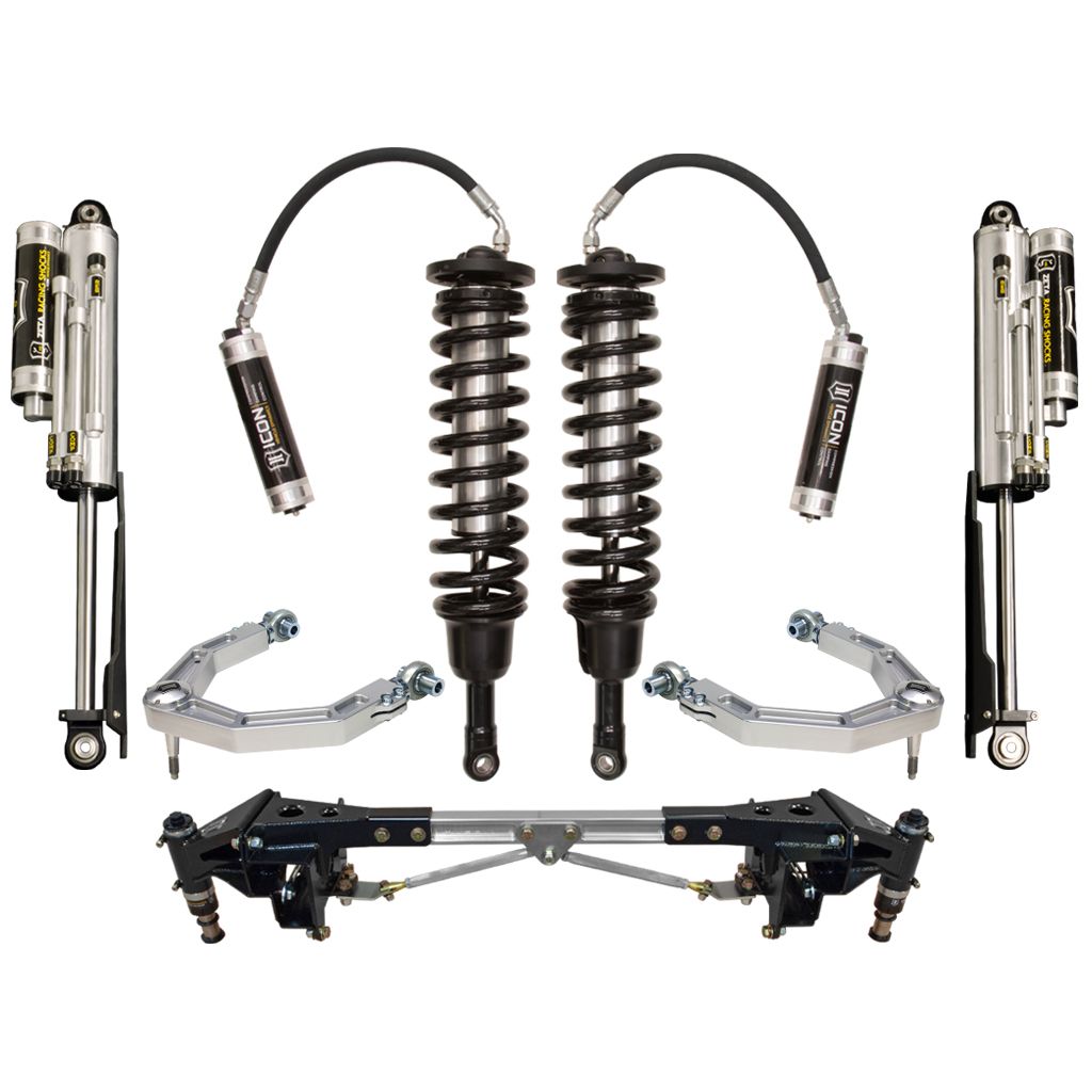 This system features upper control arms with ICON's patented Delta Joint. The Delta Joint is a heavy-duty high angle ball joint that combines the durability of a ball joint with the performance characteristics of a traditional uniball. While the industry standard uniball does a great job of allowing the control arms of a vehicle to articulate with little bind, they do have an inherent weakness that leaves more to be desired when used in a daily driven application – exposure to the elements. The Delta Joint features a zinc plated housing providing the first layer of corrosion resistance, while a tough grease seal keeps potentially harmful elements out of the inner workings of the joint. Metal on metal construction and a greaseable design increase the longevity of the Delta Joint while at the same time allowing for noise-free operation. What makes the Delta Joint unique is that it brings the best of both worlds to ICON upper control arms with features that make it more robust than a uniball, and at the same time capable of greater angularity than a typical ball joint.