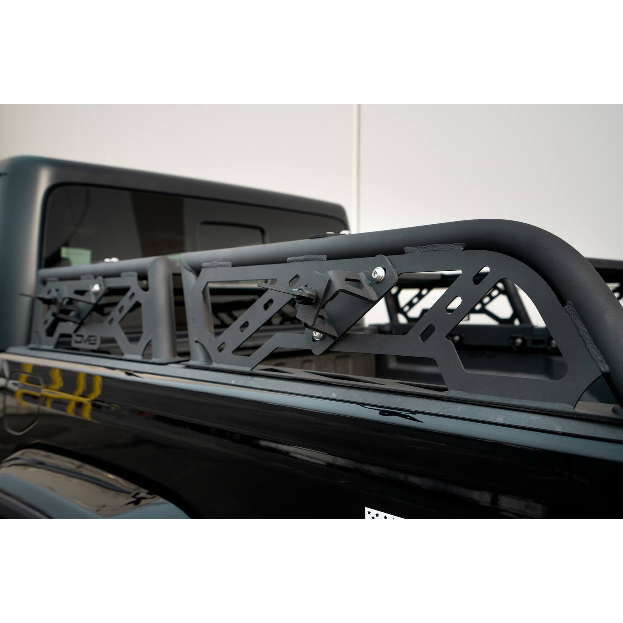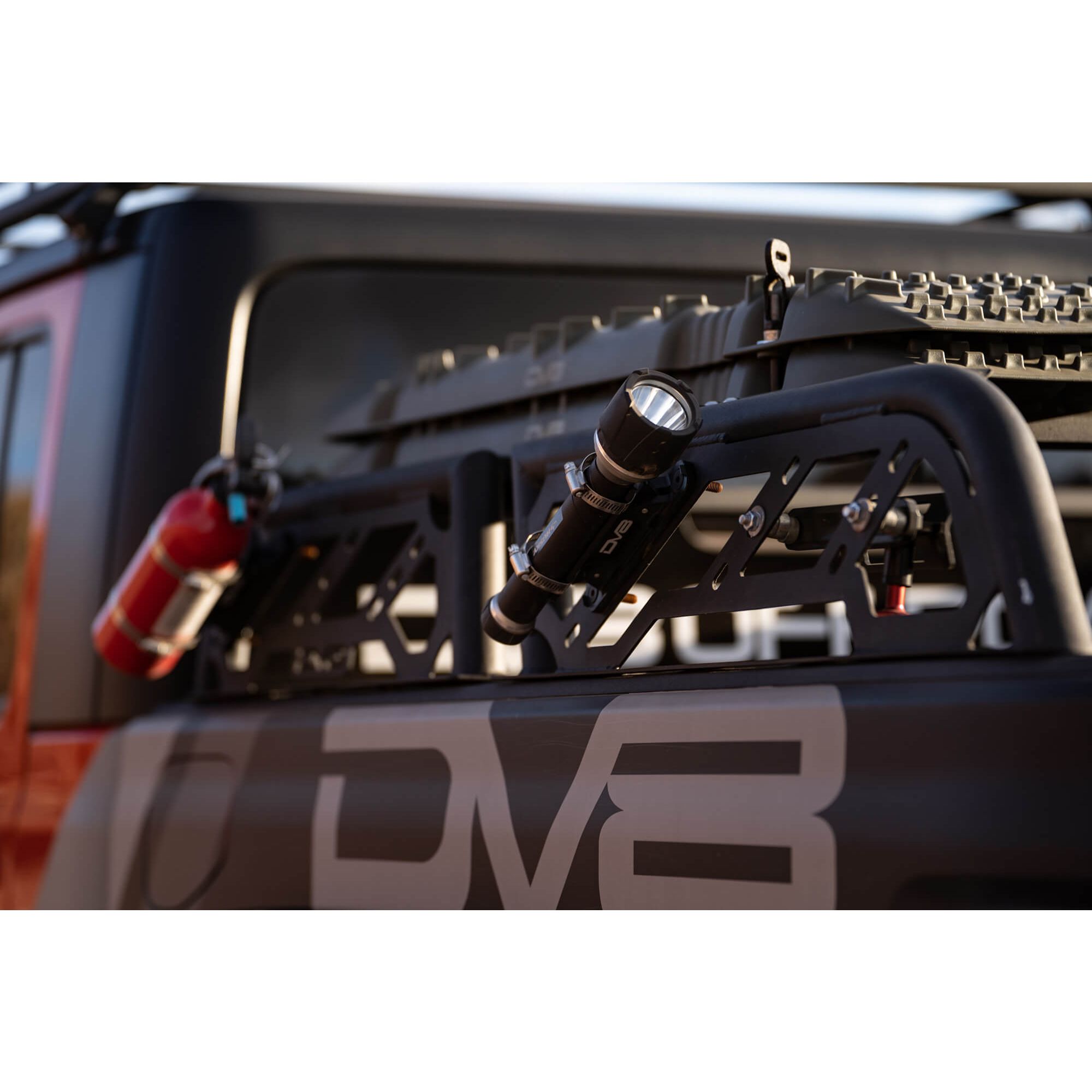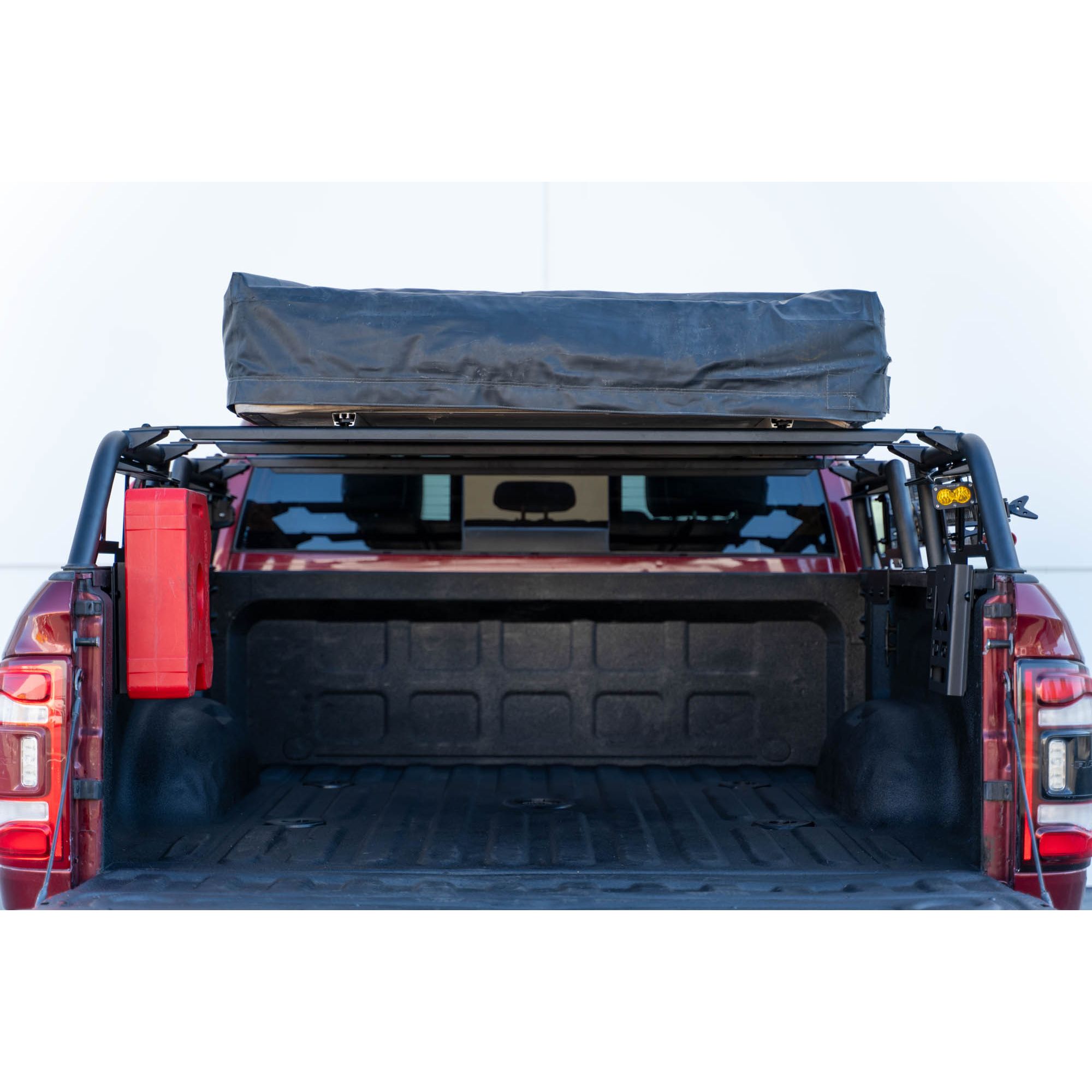 Our MTO Series Bed Rack was designed to fit a wide range of full-size trucks. The rack can be adjusted for various bed lengths. When running a RTT the top of the case will sit at or slightly above the roof of the cab; minimizing drag and wind noise. Each rack wall has accessory mounting options suitable for a range of accessories, including our universal fire extinguisher mount. We also include hardware & mounts for Hi-Lift style jacks that install to these accessory points.