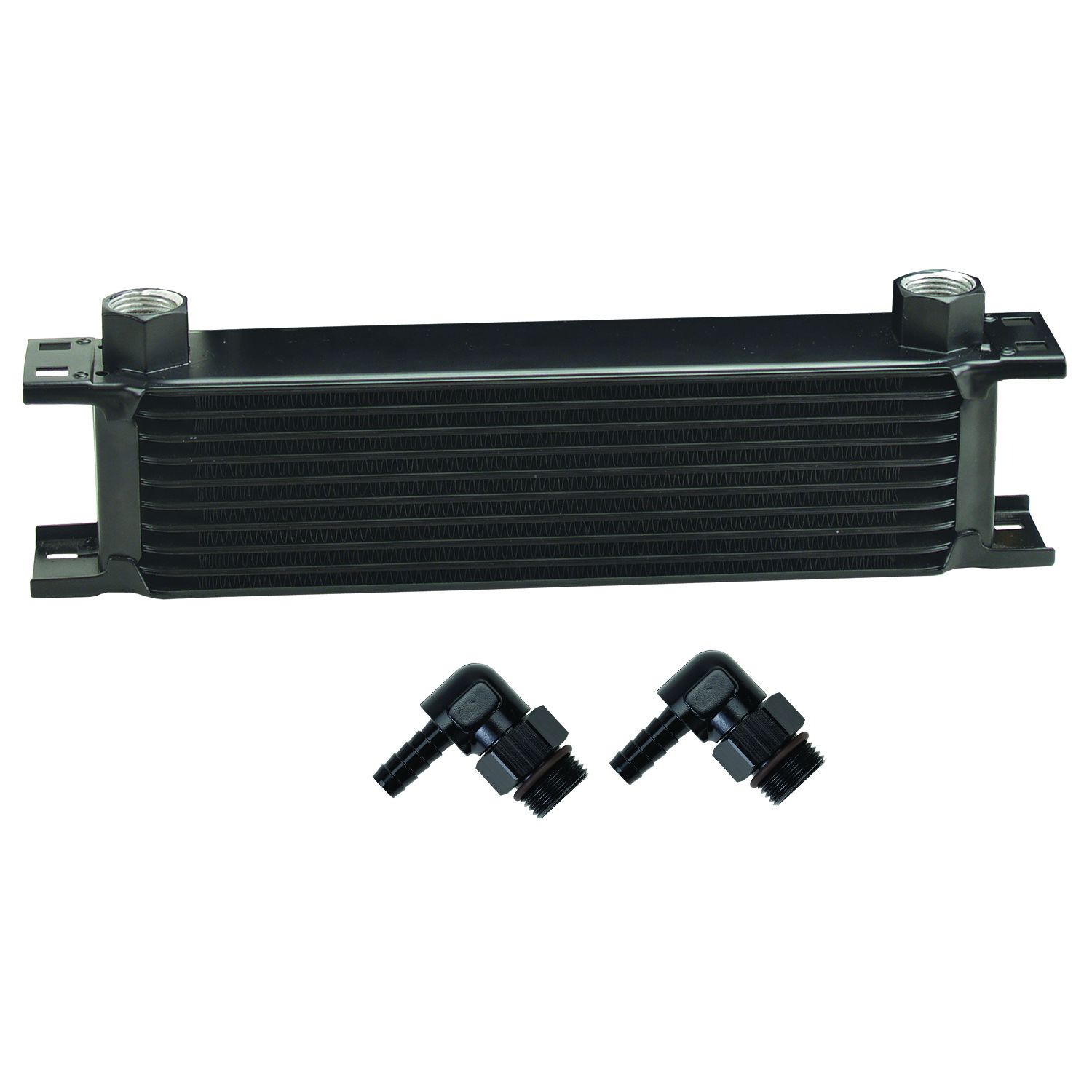 Our most efficient heat exchanger, the all aluminum 10 row Stacked Plate cooler features sturdy furnace brazed construction, full 2" deep turbulator-equipped plates and a black powder coat finish. With minimal pressure drop it can be used for engine, transmission or fuel cooling. Includes bright aluminum anodized finished 90 degree swivel -10AN male adapter fittings.
