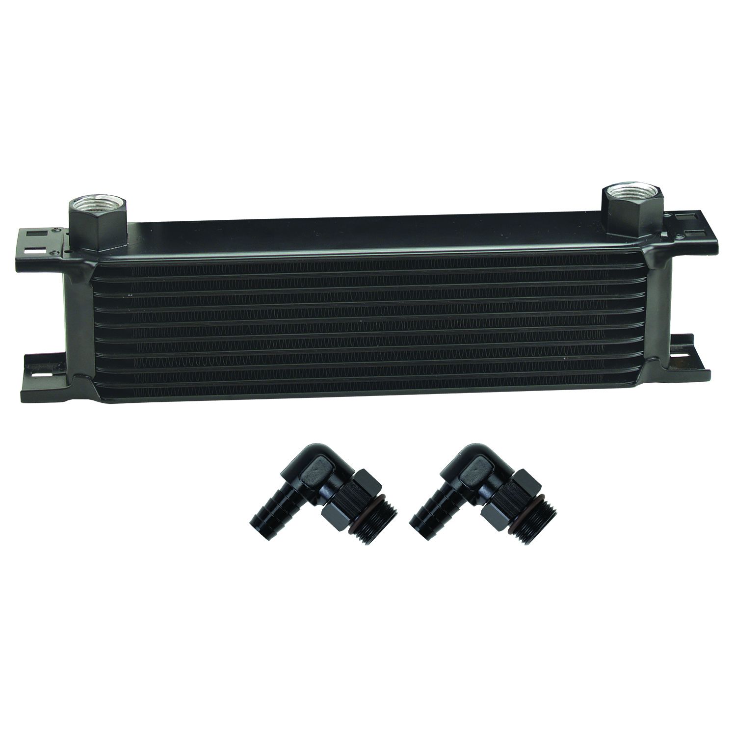 Our most efficient heat exchanger, the all aluminum 10 row Stacked Plate cooler features sturdy furnace brazed construction, full 2" deep turbulator-equipped plates and a black powder coat finish. With minimal pressure drop it can be used for engine, transmission or fuel cooling. Includes bright aluminum anodized finished 90 degree swivel -10AN male adapter fittings.