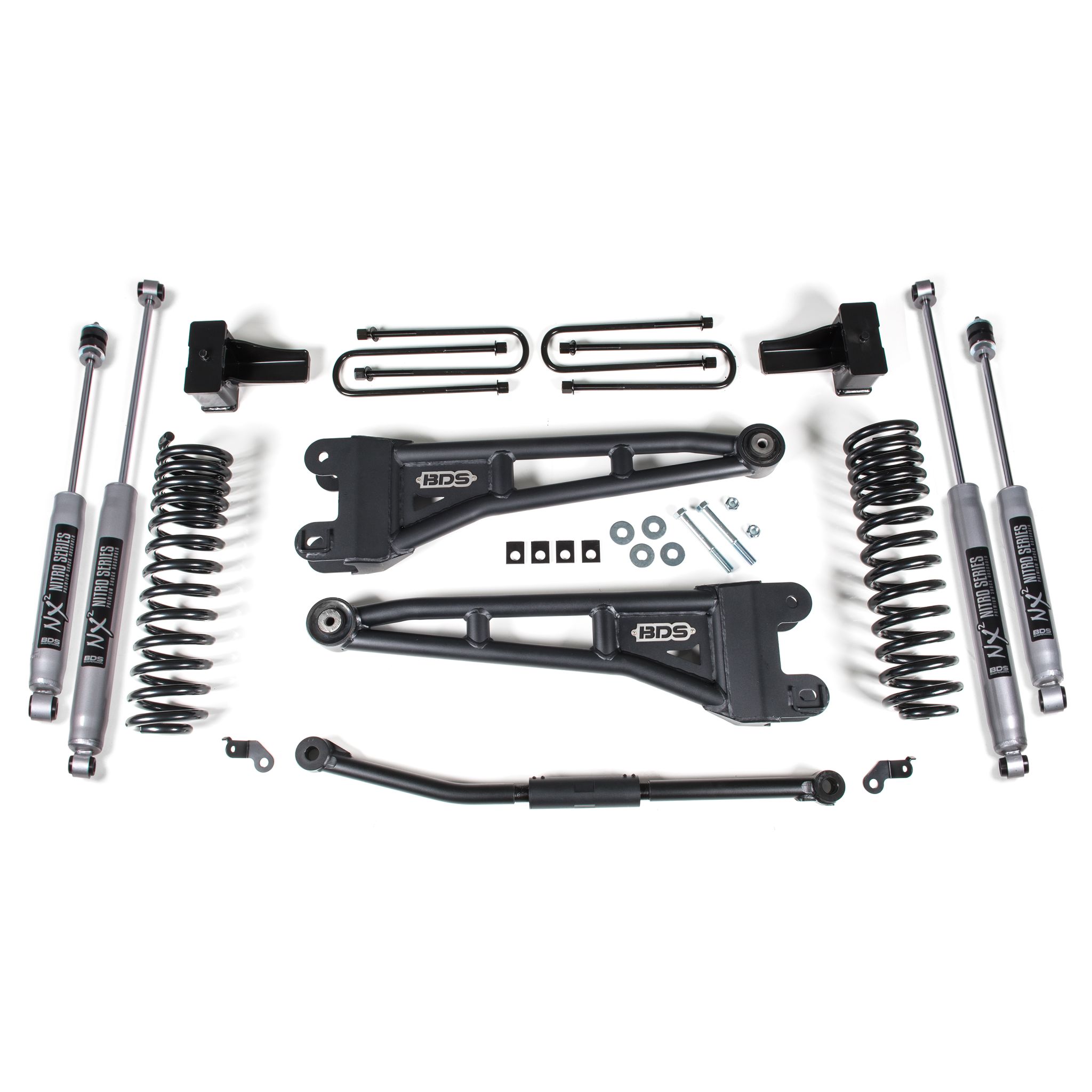 <p>Up front, the lift kit includes diesel-specific Pro-Ride coil springs, heavy-duty replacement radius arms, a high-strength 1-3/8-inch solid steel track bar for steering correction, brake line brackets, and precision-tuned nitrogen-charged shocks.</p>