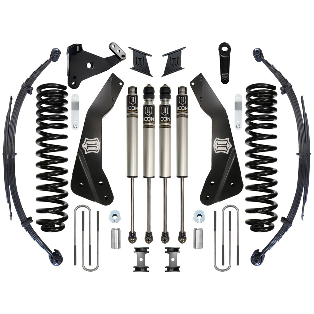 ICON Vehicle Dynamics is an industry leader when it comes to Ford Super Duty performance. Our engineers have spent countless hours under these trucks and behind the wheel developing some of the most refined suspension systems available. Increasing wheel travel and ride comfort is standard operating procedure at ICON, but our engineers aimed high to produce a suspension solution that also maintained the Super Duty’s towing capacity. ICON’s 7” Suspension System for the 2011-2016 Super Duty yields enough lift to clear 37” tires while providing excellent ride characteristics across a wide variety of terrain on and off-road. Each component of this suspension system has been specifically engineered to work in union with other ICON parts to extract maximum performance out of the vehicle. Our Stage 2 System is comprised of 7” lift dual rate coil springs, fabricated radius arm drop mounts with brushed stainless badges, track bar drop bracket, bump stop extensions, sway bar links, a forged pitman arm, brake line brackets, rear 5" lift progressive rate leaf springs w/ U-bolts, and 2.0 Aluminum Series smooth body front & rear shocks.