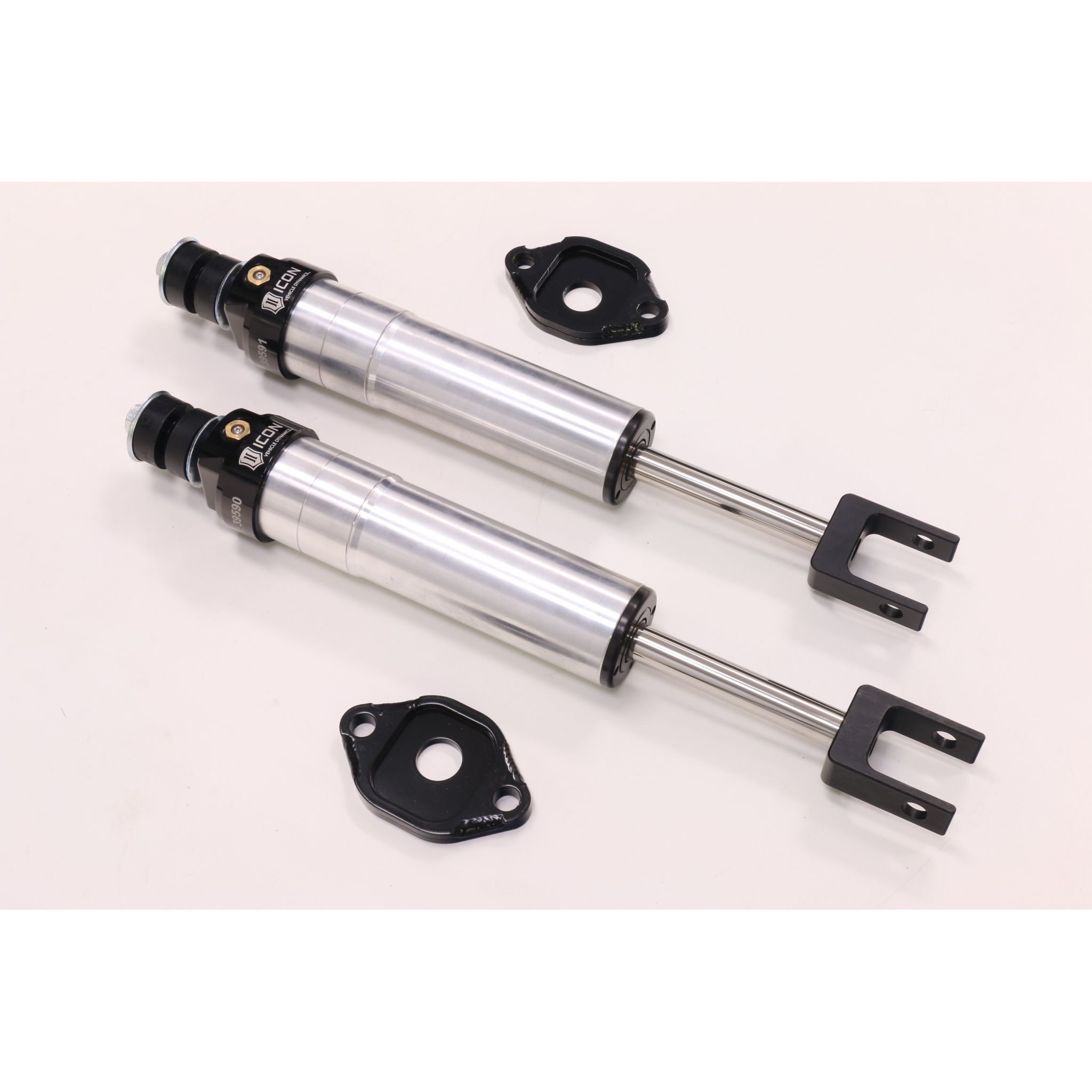 Attributed Description: ICON Vehicle Dynamics; Shock Absorber Set; Adjustable: No; Boot Included: No; Bore Diameter: 2.25 IN; Compressed Length: 13.46 IN; Fully Open Length: 18.79 IN; Gas Charged: Yes; Lower Mount Type: Clevis; Mounting Hardware Included: Yes; Shock Absorber Body End Measuring Point: Shoulder of Stem; Shock Absorber Rod End Measuring Point: Center of Clevis Holes; Stroke Length Front: 5.3 IN; Tube Outside Diameter: 2.50 IN; Upper Mount Type: Stem; External Reservoir: No