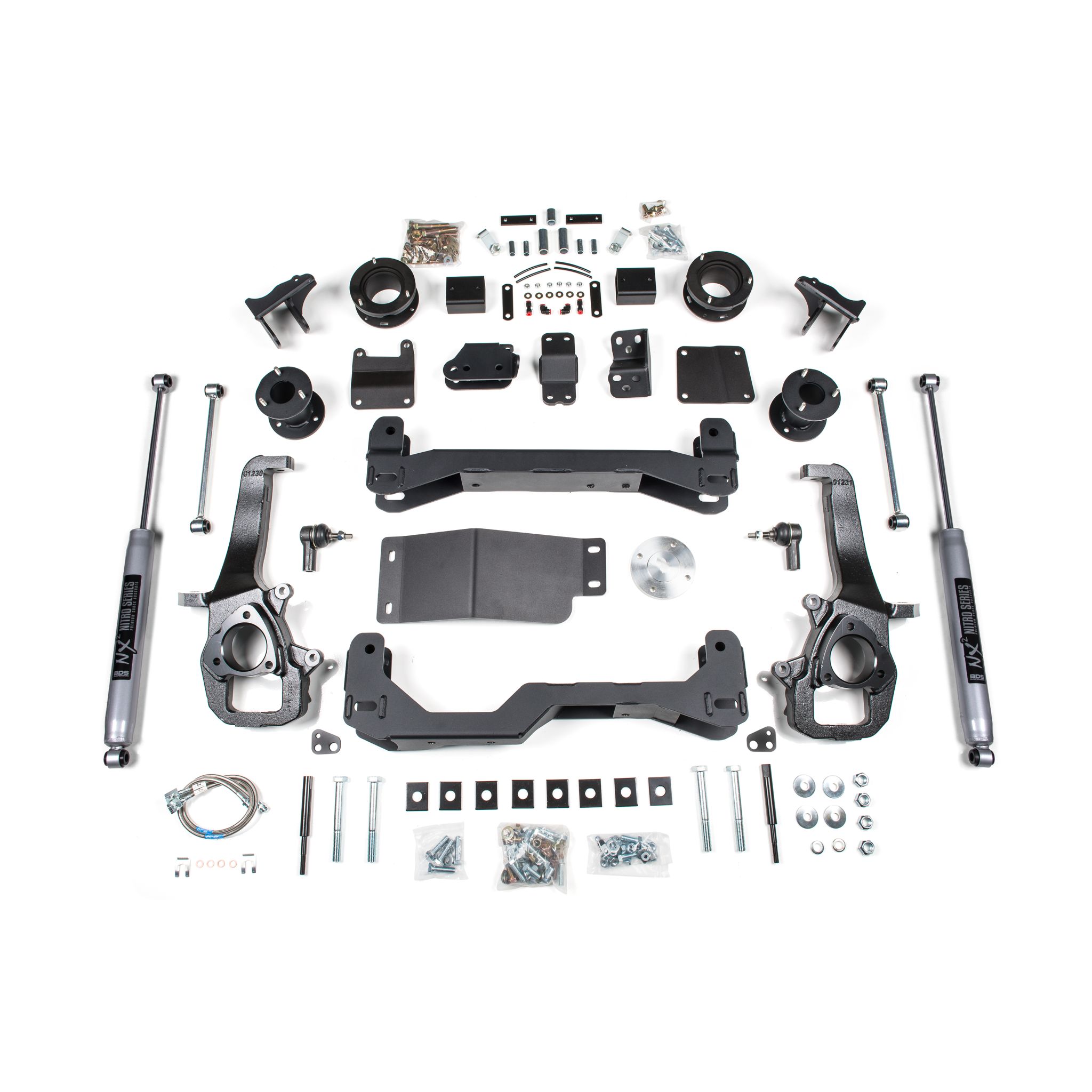 <p>This kit takes advantage of BDS's tried and true high-clearance design for improved ground clearance, strength, and offroad protection while correcting suspension and steering geometry for great on-road handling characteristics. Up front, the kit utilizes top mounted strut spacers, high-arched 1/4-inch thick steel crossmembers along with a multipiece differential relocation brackets and heavy duty skid plates built for offroad protection. Steering geometry is corrected at the new taller ride height with CNC-machined ductile iron steering knuckles and replacement tie rod ends allowing for ESC system compatibility. These combined with the provided sway bar drops, bump stop extensions, stainless steel braided brake lines, CV spacers, supplied hardware and more provide a comprehensive front suspension lift ready for whatever you throw at it.</p>
