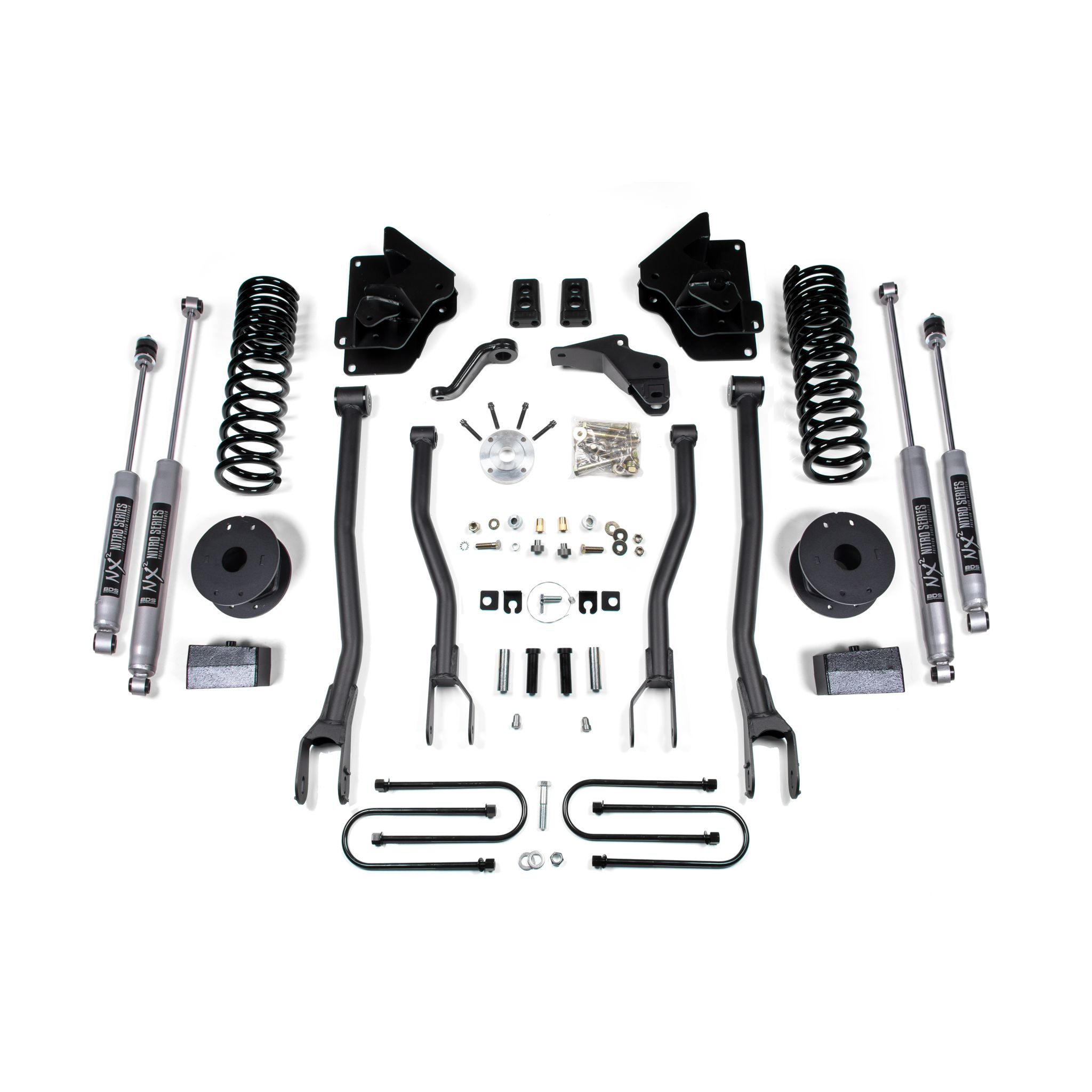 <p>Convert the factory stamped steel radius arms over to the BDS 4-link to optimize suspension geometry for better handling characteristics while adding strength and stability. This bolt-on upgrade utilizes high-strength 1/4-inch steel brackets that allow mounting of HD upper and lower control arms to correct axle positioning while limiting caster change throughout wheel travel.</p>