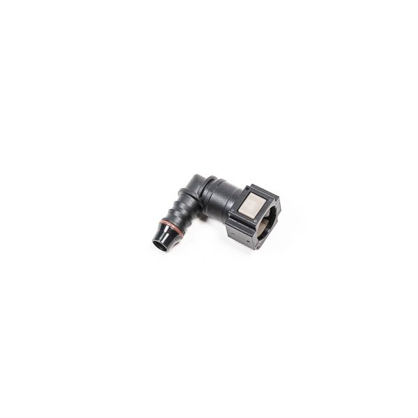Fitting, 5/16 SAE quick connect female to 3/8 Hose barb. 90 degree.