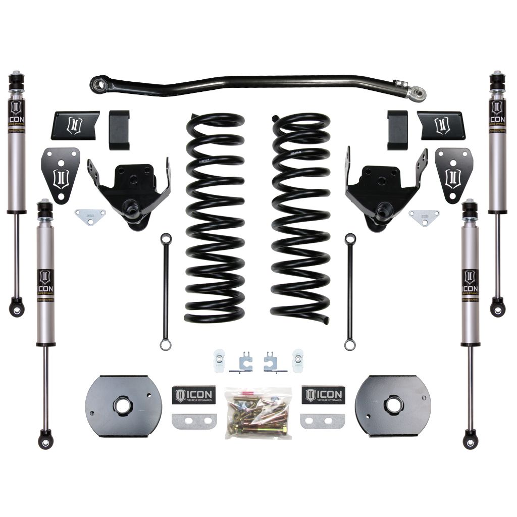 ICON Vehicle Dynamics suspension systems for the 2014-2018 Ram 2500 4WD were designed with exceptional performance and ride quality in mind. This Stage 1 system includes ICON-engineered 4.5” dual rate coil springs, high-strength laser cut bracketry, billet bump stop spacers, fabricated rear coil spacers, and all hardware necessary for a complete install. Vehicle-specific ICON 2.0 Aluminum Series shocks help deliver balanced performance front to rear, making it the perfect suspension system for any 2014-UP Ram 2500 4WD that's tasked with daily driving, towing, and light off-road use.