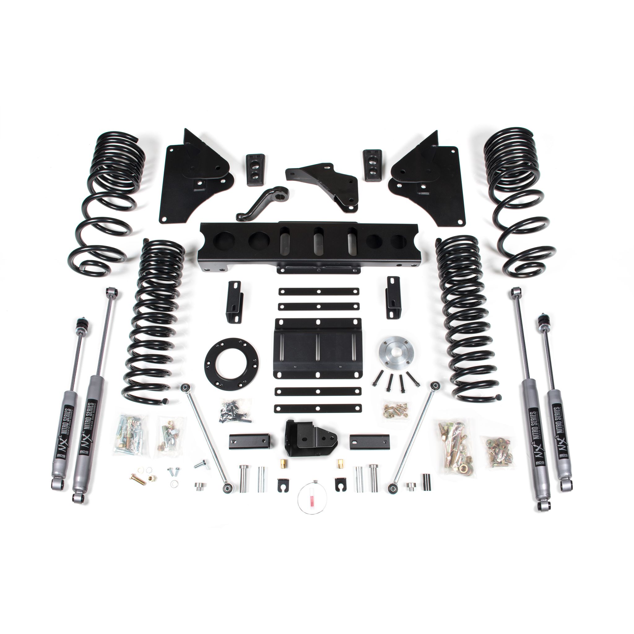 <p>Up front the lift kit includes gas-specific Pro-Ride coil springs, heavy-duty radius arm drop brackets, forged drop pitman arm and track bar bracket for steering correction, sway bar relocation, brake line brackets and precision tuned NX2 or FOX 2.0 nitrogen charged shocks.</p>