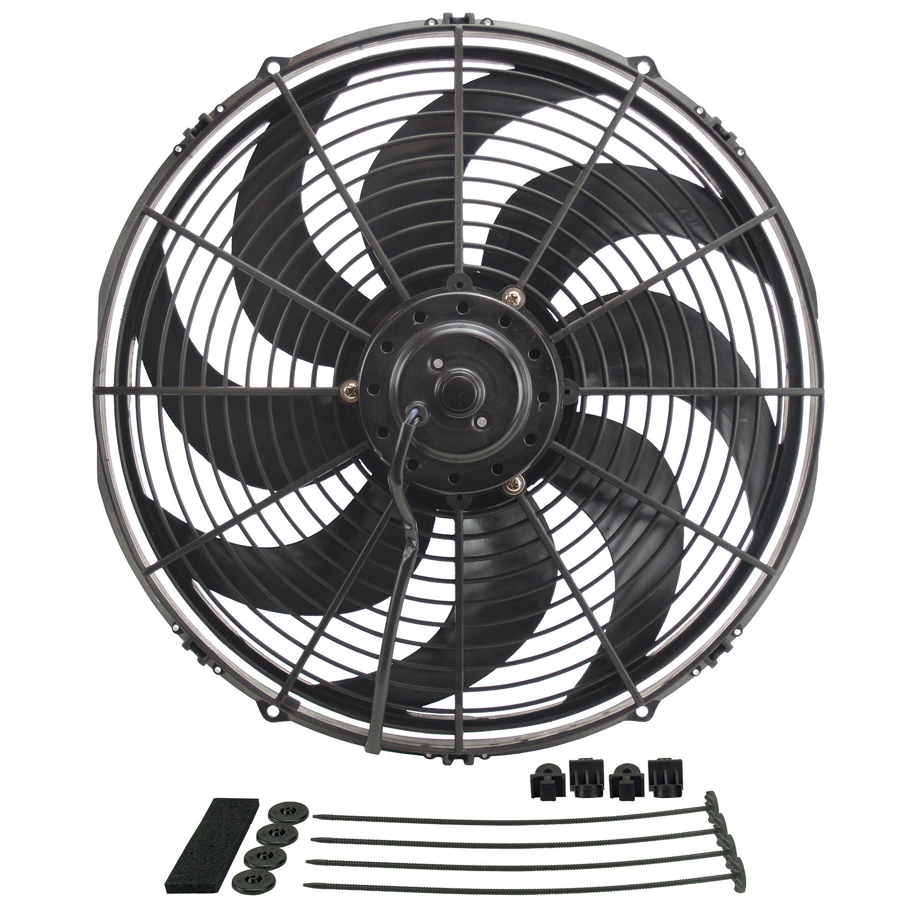 Our 16" Dyno-Cool curved blade electric fan boasts a powerful low-profile fan moving 1980 CFM at 0 static pressure and draws 17.3 amps. Every fan comes with a fan mounting kit consisting of 4 plastic through radiator core rods and clips, 4 foam pads and 4 mounting feet.