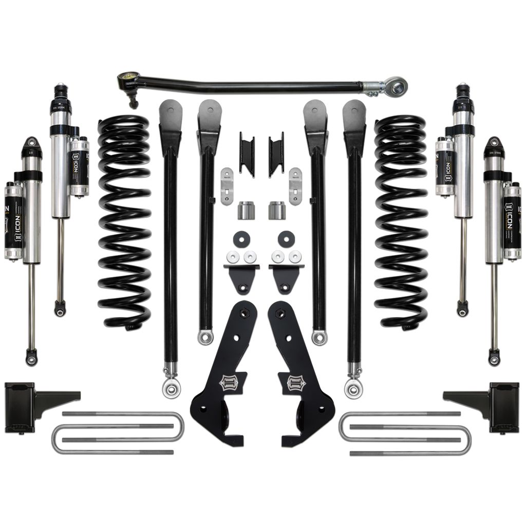 The Stage 4 system sees the inclusion of the ICON Vehicle Dynamics Ford Super Duty 4-Link kit, which further improves performance by eliminating suspension bind commonly experienced with factory radius arms during articulation. This “freeing up” of the front end and the ability of the 4-Link Kit to maintain positive caster through the range of travel equates to an unparalleled ride quality in all conditions. With the endless hours ICON has spent testing and tuning our suspension components and shocks as a complete package, you can rest assured knowing that you have the best suspension solution on the market.