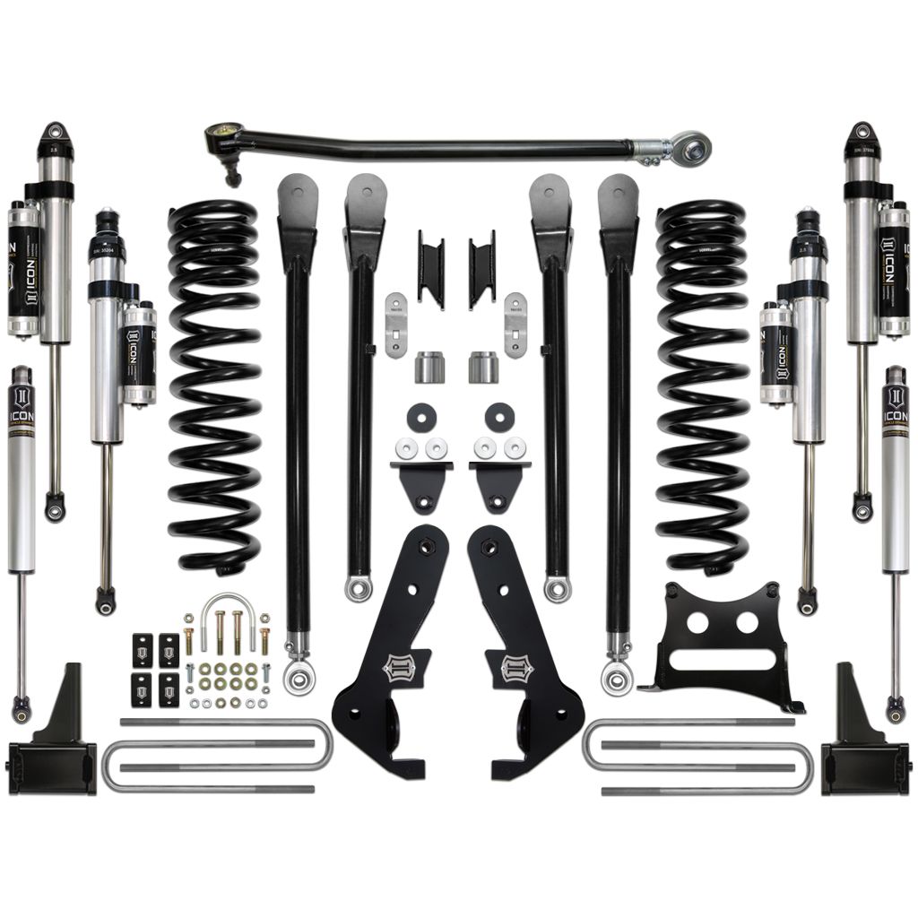 The Stage 5 system sees the inclusion of the ICON Vehicle Dynamics Ford Super Duty 4-Link kit, which further improves performance by eliminating suspension bind commonly experienced with factory radius arms during articulation. This “freeing up” of the front end and the ability of the 4-Link Kit to maintain positive caster through the range of travel equates to an unparalleled ride quality in all conditions. With the endless hours ICON has spent testing and tuning our suspension components and shocks as a complete package, you can rest assured knowing that you have the best suspension solution on the market.
