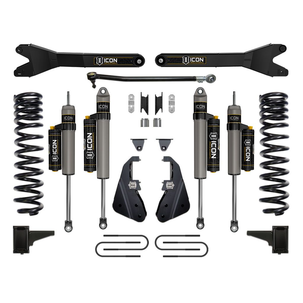This Stage 4 system sees the inclusion of the ICON Vehicle Dynamics Ford Super Duty Radius Arm System that feature a sealed pivot bushing that minimizes road feedback and ensures a long life and quiet operation. Additionally, their fabricated, fully boxed design ensures strength and utilizes a profile optimized for tire clearance at full steering lock, making a 37” tall tire clear without coming in contact with the radius arm.