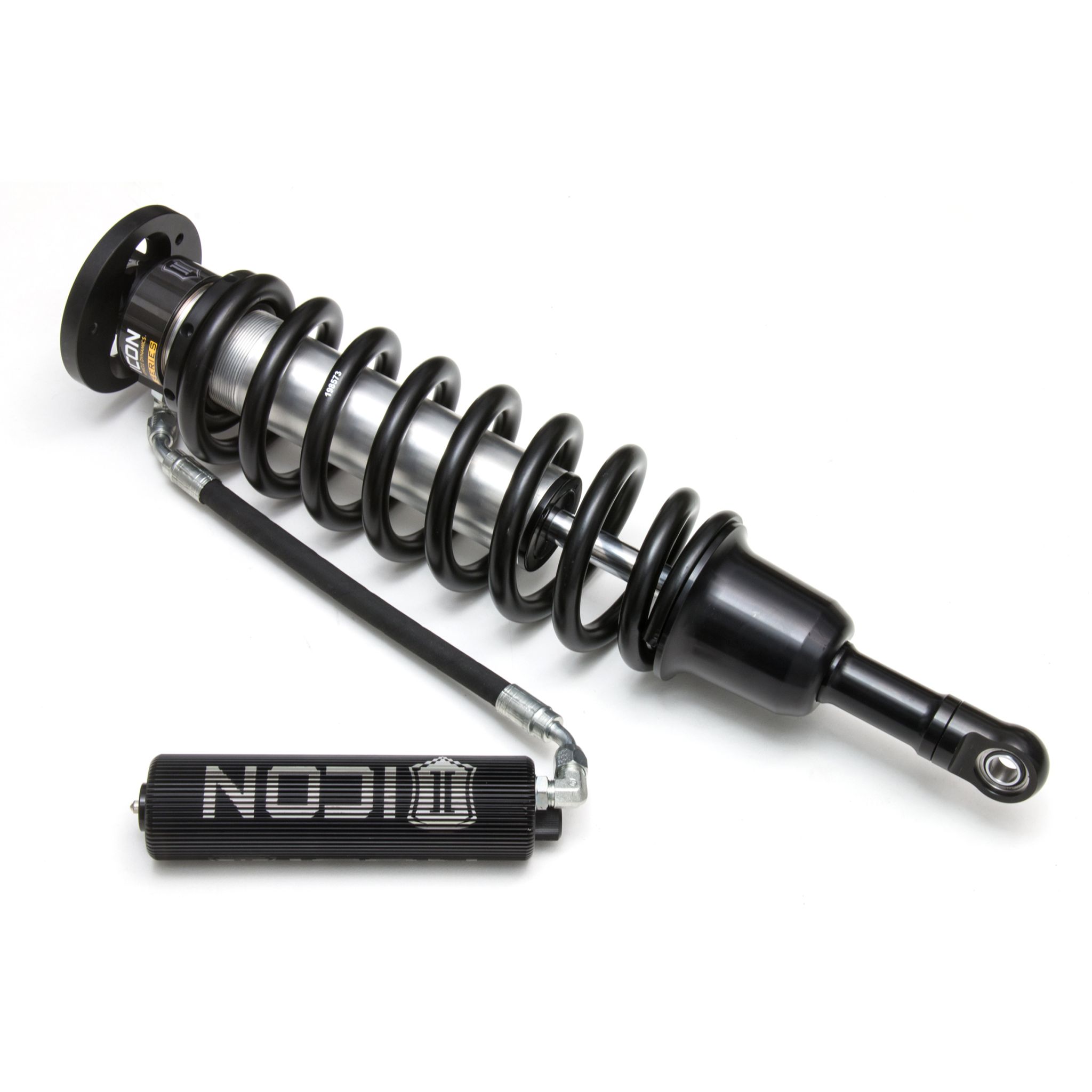 The front end geometry of the Gen 2 Raptor was found to be fairly similar to the previous model truck, however the shock mounting points had been moved higher up on the chassis. Seeing this as an opportunity, the team was able to design a 3.0 Series coilover that has more shaft travel while utilizing a barreled coil spring for more efficient packaging. The vehicle-specific valving featured in these shocks and the all new ICON-engineered spring work together to provide exceptional on-road ride quality with excellent off-road characteristics. ICON’s multi-stage hydraulic “Bump Zone” adds to the performance capability by providing an exponential increase in damping ability during the last 40% of compression travel for superior bottom-out resistance. In the ride zone, these 3.0 Series coilovers see a 50% increase in damping ability with the use of a significantly larger piston than what is found in the factory shocks. New 10” finned aluminum reservoirs provide a generous amount of shock oil while also providing an increase in surface area for enhanced cooling and consistent damping. The addition of ICON’s CDC Valve technology provides 10 settings of damping adjustment allowing the end-user to adjust the “feel” of the shocks for different terrains and vehicle cargo configurations. All of these features work together to deliver the perfect blend of on-road comfort and off-road performance.