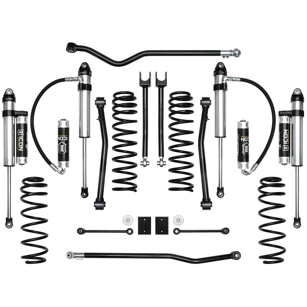 The ICON Vehicle Dynamics Stage 6 2.5" Suspension System for the 2018-UP Jeep Wrangler JL is designed for the driver looking to drastically improve the performance and ride quality of their vehicle. This Stage 6 system includes 2.5" lift dual rate coil springs, upgraded 2.5 Aluminum Series remote reservoir shocks with vehicle specific valving, tubular steel adjustable front upper links, fixed front lower links, adjustable front and rear track bars, bump stop spacers, sway bar links, and all necessary hardware to complete the installation. With this combination of components, ICON was able to increase wheel travel numbers by over 30% (3" front, 2" rear), redefining the potential of the 2018-UP JL. The front lower links included with this system are constructed from thick wall steel tubing, provide increased castor numbers, and feature dual durometer bushings for noise free operation, maximum articulation, and minimal bind. The Stage 6 system allows for fitment of 35" tires when used with ICON's recommended wheel specifications. For users looking to install 37" tires, an optional bump stop spacer kit (PN: 22029) is available.