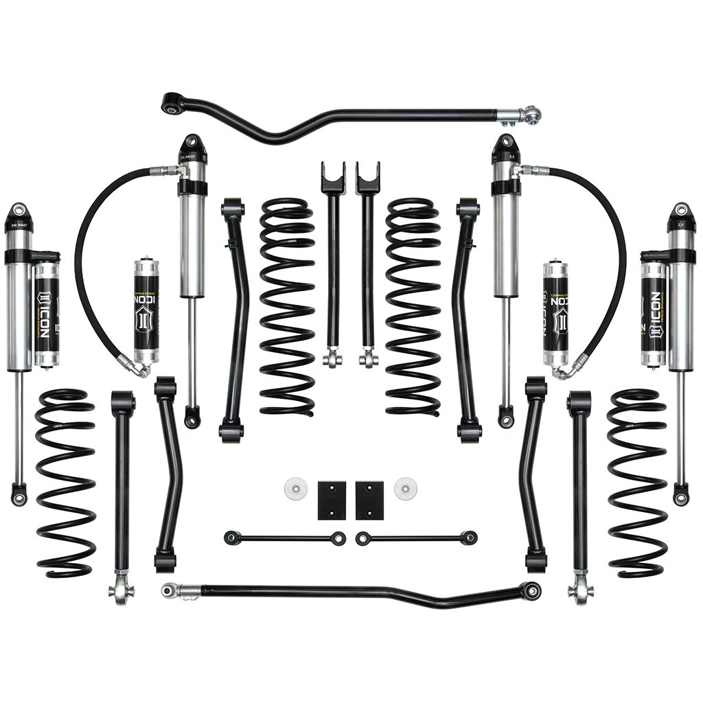 The ICON Vehicle Dynamics Stage 7 2.5" Suspension System for the 2018-UP Jeep Wrangler JL is designed for the driver looking to drastically improve the performance and ride quality of their vehicle. This Stage 7 system includes 2.5" lift dual rate coil springs, upgraded 2.5 Aluminum Series remote reservoir shocks with vehicle specific valving, tubular steel adjustable front upper links, fixed front lower links, fixed rear upper links, adjustable rear lower links, adjustable front and rear track bars, bump stop spacers, sway bar links, and all necessary hardware to complete the installation. With this combination of components, ICON was able to increase wheel travel numbers by over 30% (3" front, 2" rear), redefining the potential of the 2018-UP JL. The Stage 7 system allows for fitment of 35" tires when used with ICON's recommended wheel specifications. For users looking to install 37" tires, an optional bump stop spacer kit (PN: 22029) is available.