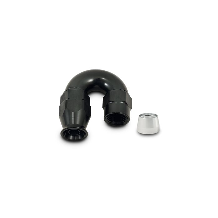 Vibrants offering of non-swivel High Flow Hose End Fittings, designed exclusively for use with our offering of PTFE lined flex hose, deliver the type of quality, leak-free reliability and incredible ease of assembly that industry professionals will appreciate. Now also available in -12 AN. These CNC Machined 6061 Aluminum Alloy Hose Ends feature a full flow design and are optimal for use in race fuel systems as well as Nitrous, Cooling, Oil, Power Steering and Coolant (not suited for brake and hydraulic line applications). Each of these Hose Ends include an Aluminum olive that compresses to the PTFE liner for simple, leak free assembly. Available in Black Hard Anodized finish only.