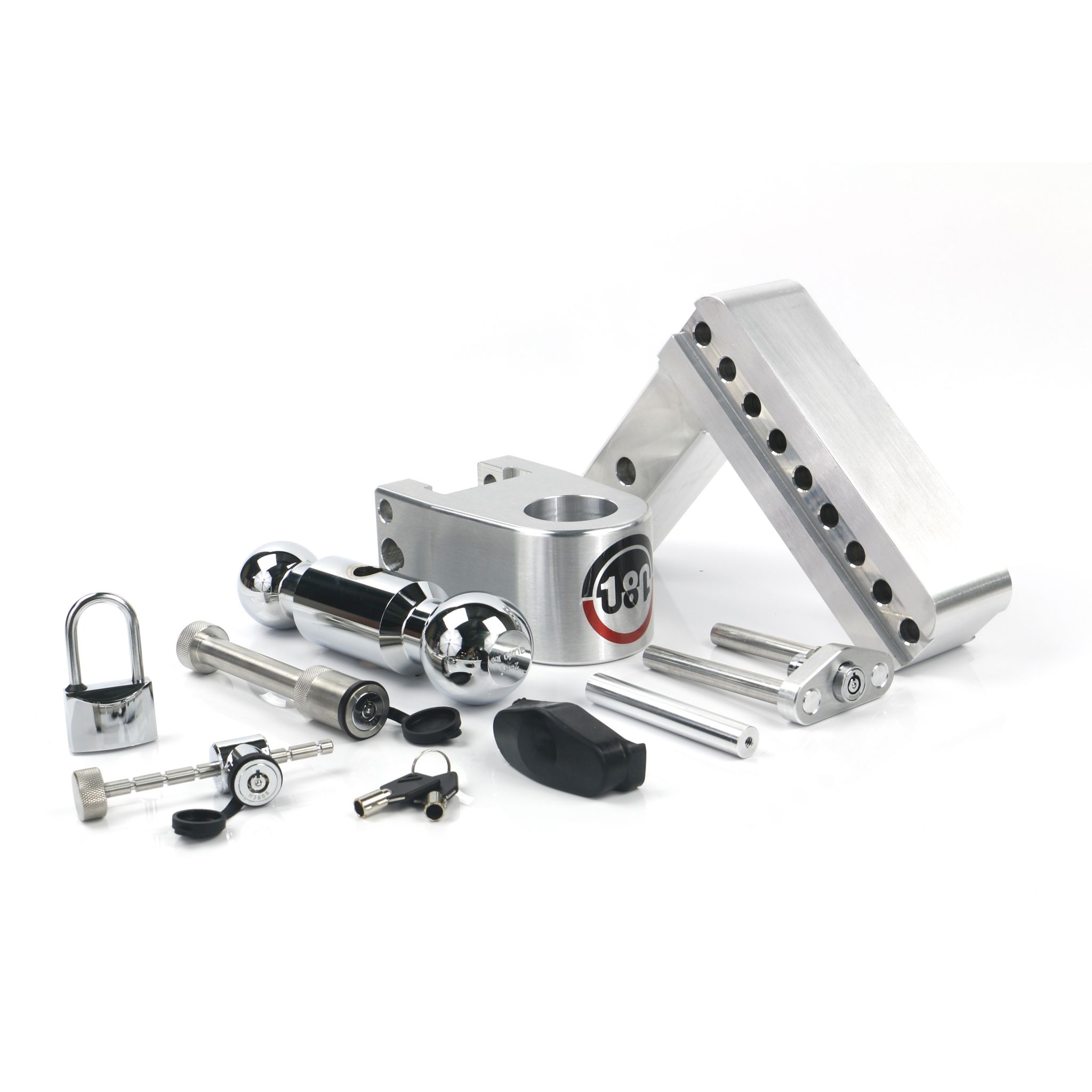 180 Hitch – Adjustable Drop Hitch w/ 6" Drop & 2" Shank + Chrome-Plated Steel Combo Ball (2" & 2 5/16") 12,500 lbs. GTW with Keyed-Alike Hitch Pin Lock, Coupler Latch Lock, & Padlock