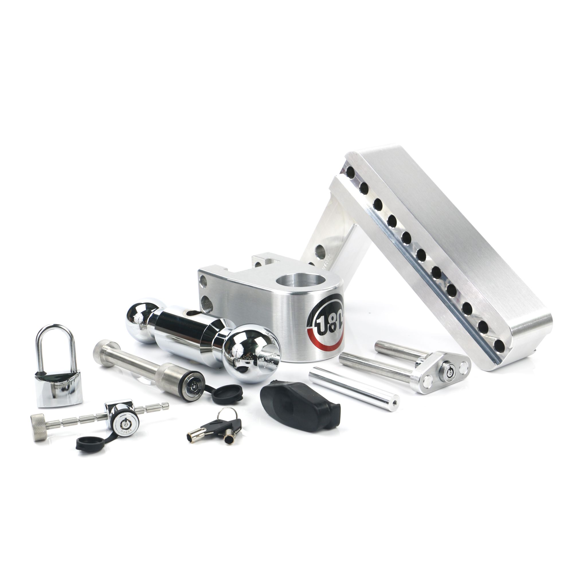 180 Hitch – Adjustable Drop Hitch w/ 8" Drop & 2" Shank + Chrome-Plated Steel Combo Ball (2" & 2 5/16") 12,500 lbs. GTW with Keyed-Alike Hitch Pin Lock, Coupler Latch Lock, & Padlock