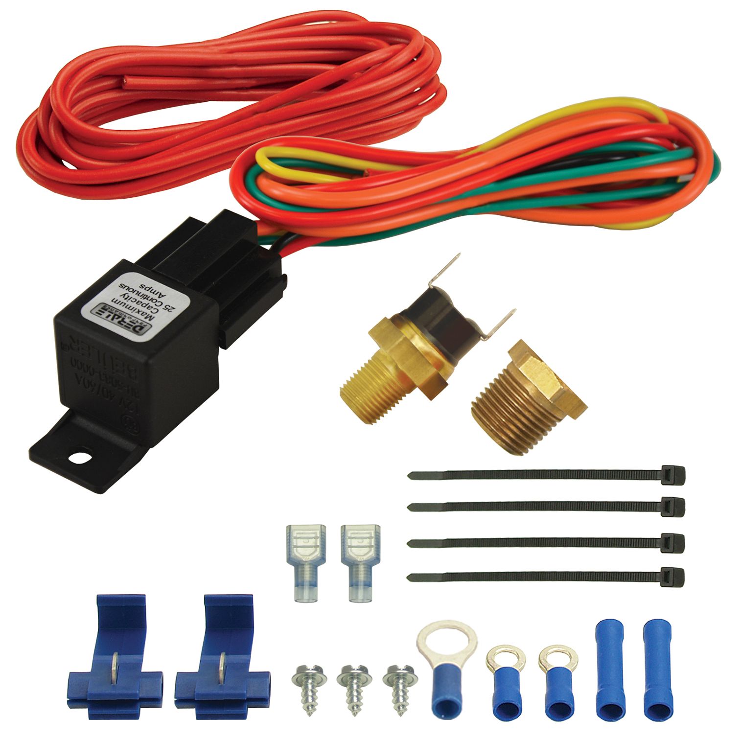 This 180°F-on/165°F-off electric fan controller kit includes the 1/8" NPT threaded switch, 1/8" x 3/8" NPT adapter bushing and a relay wire harness to make it an easy installation. Maximum capacity on this kit is 25 amps.