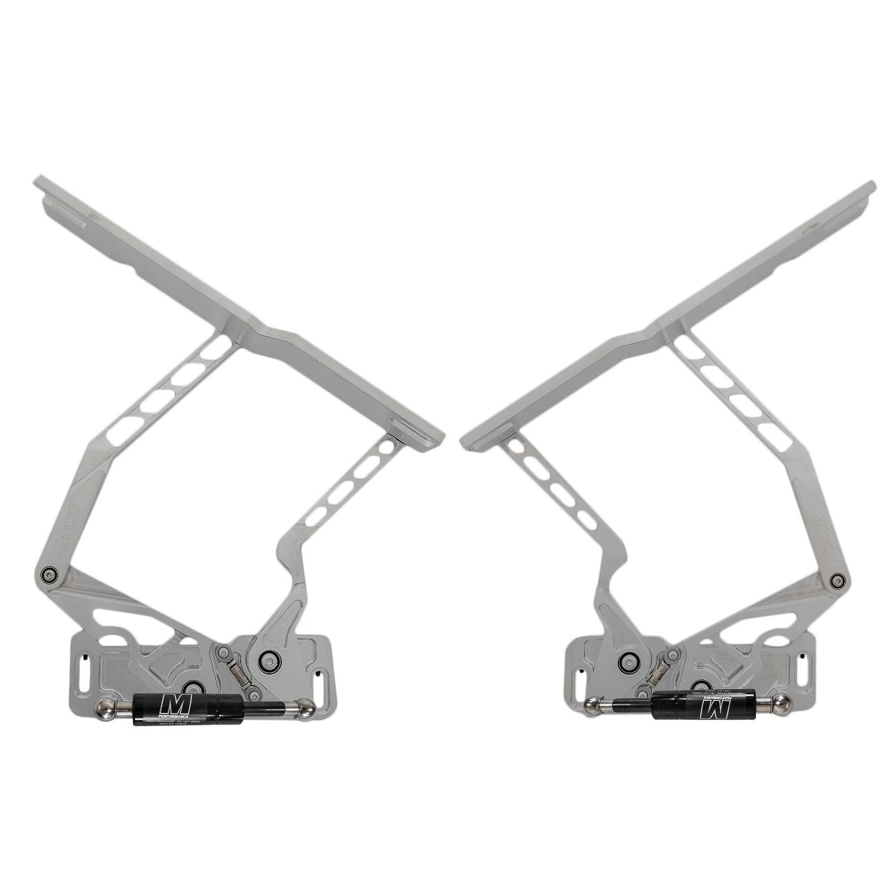 Metal fatigues and springs weaken over time. Just like an engine needs to be freshened, so do hinges. The new line of billet hood hinges from March Performance are packed with features that don’t just look the part, they play it. With our patented (No. 11,002,047) 6-axis adjustment built directly into the hinge, this technology affords the installer the ability to adjust hood gaps without having to remove the hood. In addition to the 6-axis adjustment these hinges feature rock-solid gas struts and sealed bearings that connected to the stylish, precision-machined 6061-T6 billet aluminum bodies and arms. March Hood Hinges are designed to work with all styles of hood whether it be Steel, Fiberglass, Carbon Fiber, or any other aftermarket material. Be sure to select the correct material when placing your order.