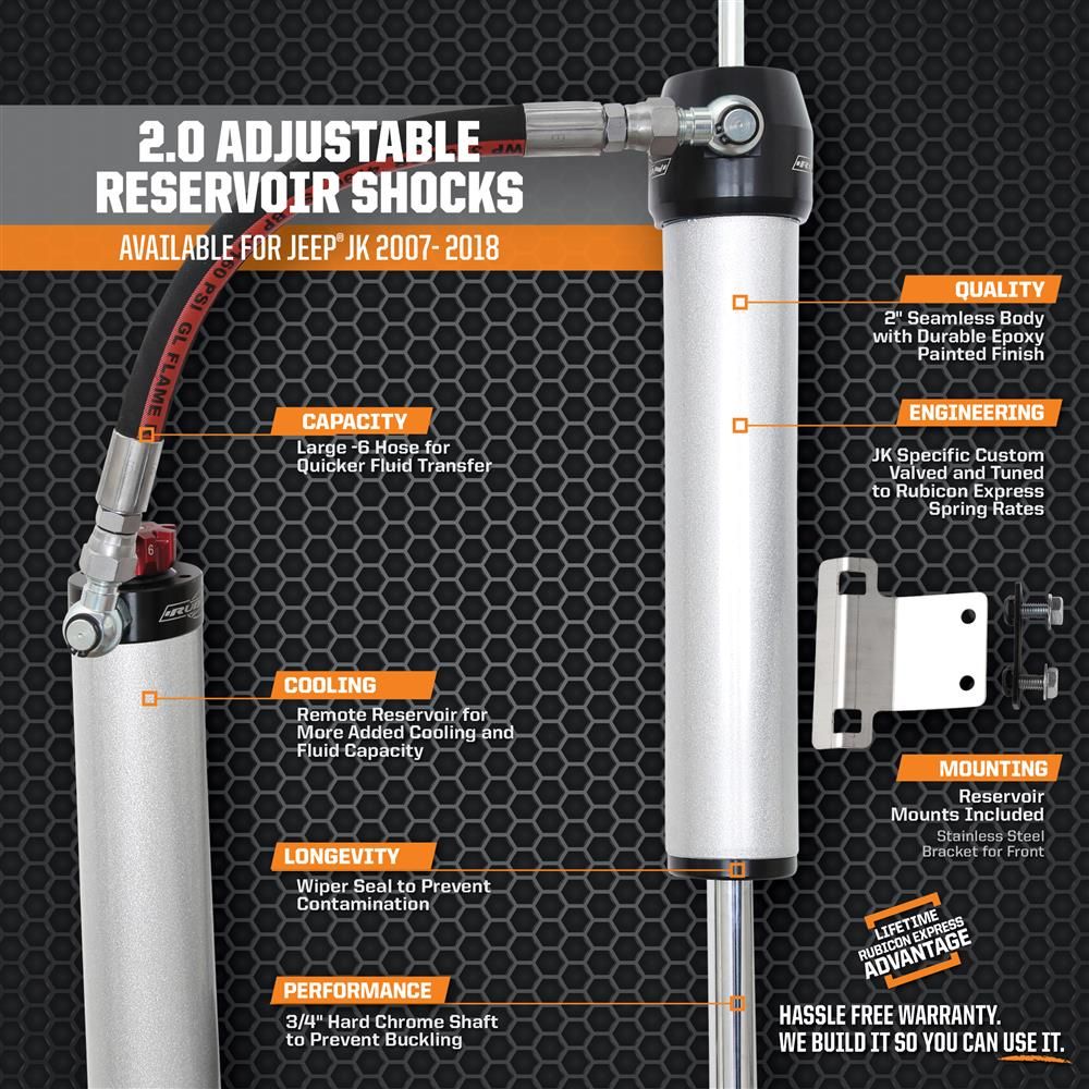 Make Shock Fade A Thing Of The Past With Rubicon Express' Remote 2.0 Adjustable Reservoir Shock Absorbers. The Gas Charged Monotube Shock Body Is Supplemented By An External Reservoir That Doubles Fluid Capacity To Shed Heat. Specifically Tuned To Rubicon Express Spring Rates, These Remote Reservoir Shocks Are Custom Valved With Eight Stages Of Adjustability For A Plush Ride In Any Terrain.