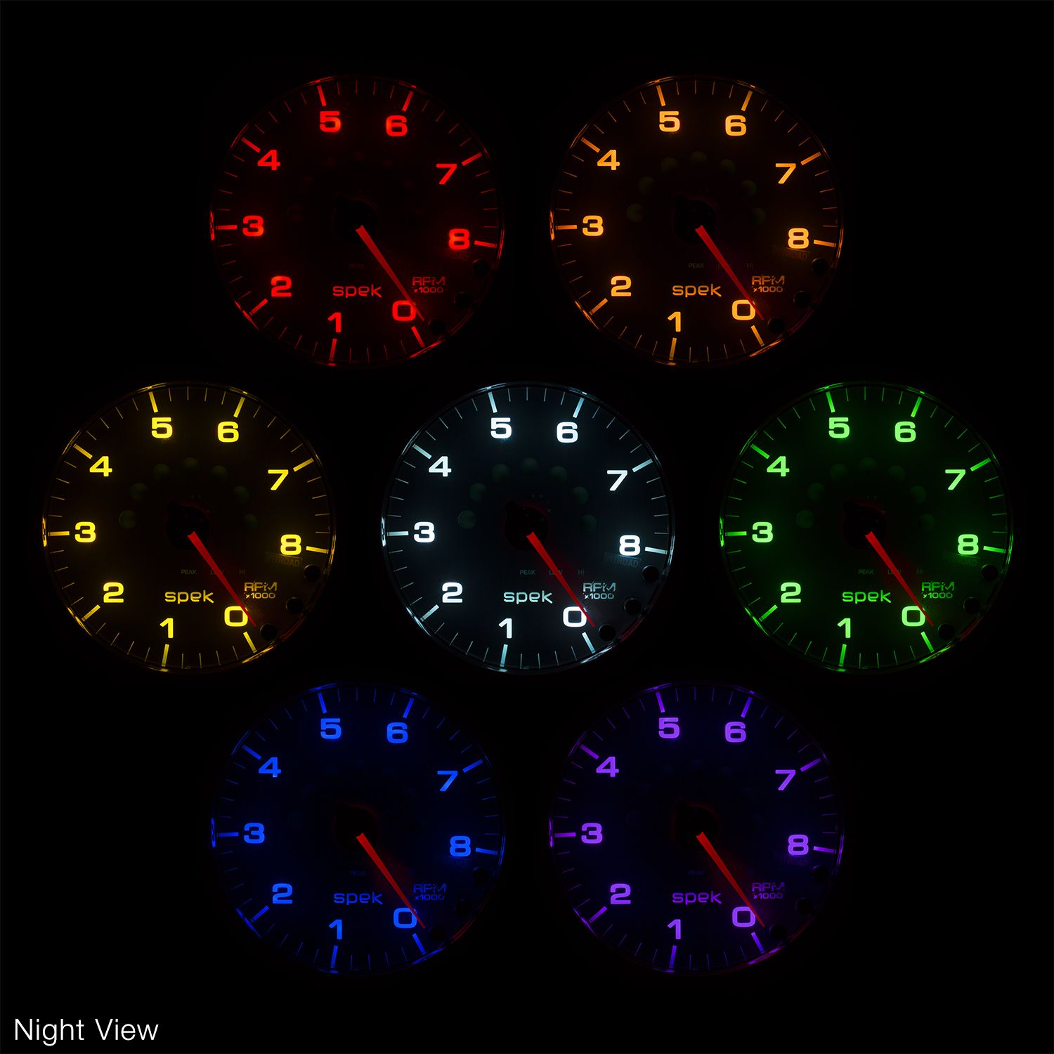 7 color user-selectable background illuminations (red, blue, green, white, yellow, orange, and violet) with adjustable brightness for day and night – with independent dimming of dial and pointer.