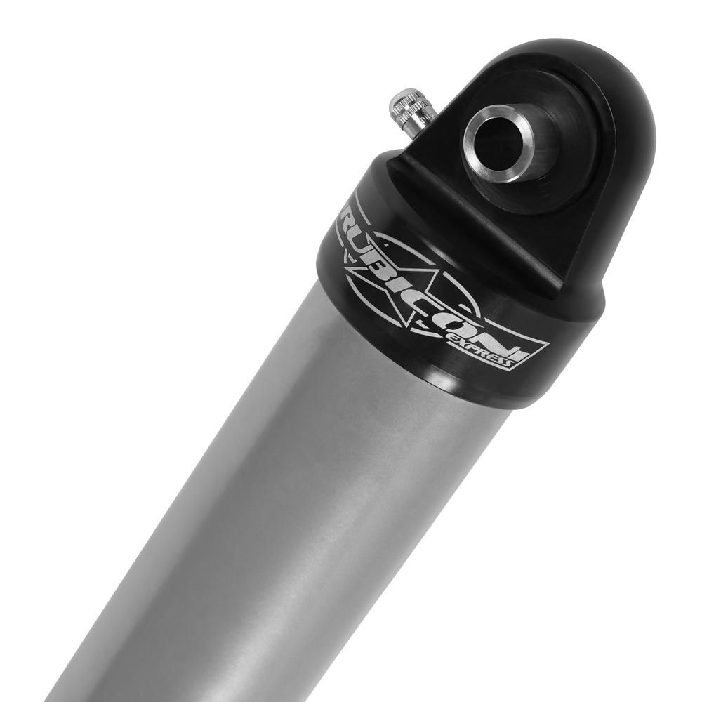 Rubicon's 2.5" Extreme-Duty Monotube Shocks are developed and tuned specifically for each application. This is the only way to deliver maximum control while not compromising ride quality, high-speed stability and comfort for those extended trips over the toughest terrain. 2.5" body outer diameter with full bore piston to maximize damping capability is tuned specific to Rubicon Express spring rates to maximize ride quality and suspension travel. The shocks include a hydraulic rebound cut off to eliminate harsh top-out. Shocks feature 6061-t6 billet aluminum black anodized components and a 7/8" od hardened chrome shaft for increased durability and strength. The non-reservoir floating piston separates nitrogen and oil to eliminate cavitation and a wiper seal to prevent contamination. A durable powder coat finish allows for years of protection. Shocks are backed by Rubicon Express' advantage lifetime warranty.