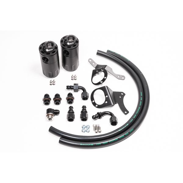Dual catch can kti for the 2015-17 Ford Mustang. Catch cans mount to the front of the engine and interface with the PCV valve hose and crankcase vent hose. Includes Radium's Fluid Lock catch cans (patent pending).