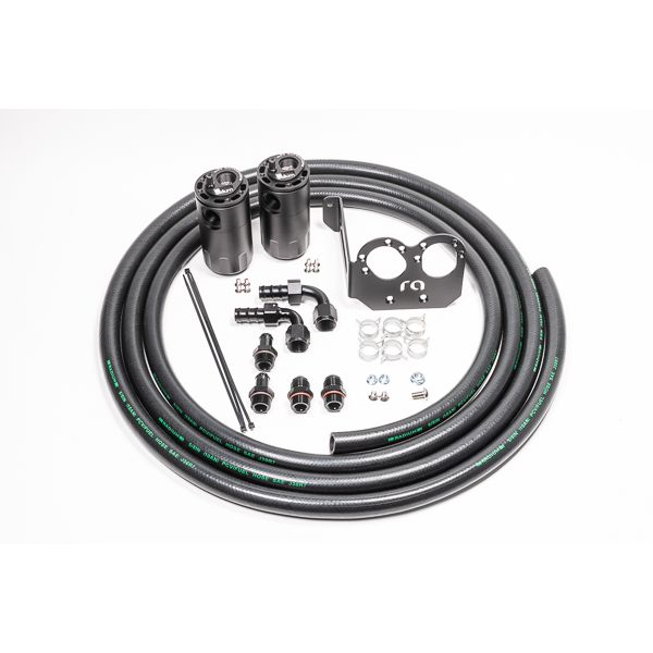 Dual catch can kit for the Ford S197 Shelby GT500. Interfaces with both the crankcase vent line and PCV line. Includes all parts for easy bolt-in installation. Includes Radium's Fluid Lock catch cans (patent pending).