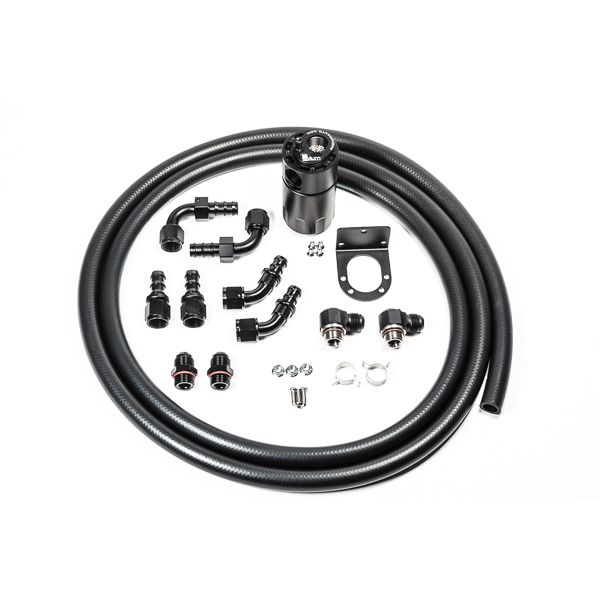 Universal single catch can kit with hoses and fittings for 10AN (5/8 inch ID) hose. Comes with a universal mounting bracket, a variety of adpater fittings and 10 feet of hose for installation into any vehicle.