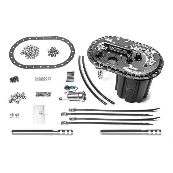 Drop-in surge tank system for competition fuel cells. Designed for Walbro F90000-series pumps. One lift pump and two primary pumps included. Easily serviceable with new lift-out fuel pump modules.