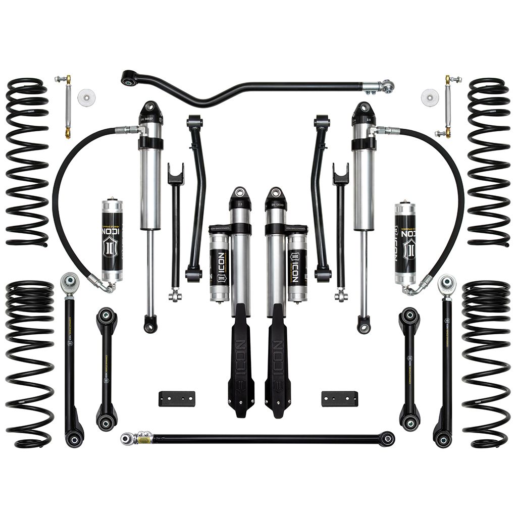 The Stage 7 ICON 2.5” Suspension System for the Jeep Gladiator is the ideal setup for drastically improving off-road performance and overall ride quality for the application that will see frequent heavy off-road use. This complete suspension system features ICON’s proven 2.5 Aluminum Series shocks, 2.5” lift dual-rate front coil springs, tubular steel fixed lower and adjustable upper front links, billet front sway bar links, a triple-rate rear coil spring kit, tubular steel fixed upper and adjustable lower rear links, a rear sway bar relocation kit, front and rear adjustable track bars, and all necessary hardware for install. This system provides an increase of over 30% front and 20% rear wheel travel and was designed around the use of a 35” tire. For those looking to run a 37” tire this can be achieved with the ICON Jeep JT Bump Stop Spacer Kit (Part #22071).