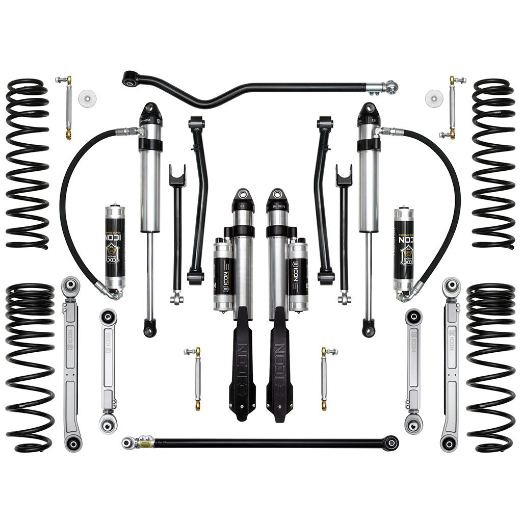 The Stage 8 ICON 2.5” Suspension System for the Jeep Gladiator is the ultimate setup for drastically improving off-road performance and providing an end-user adjustable ride quality for the application that will see heavy off-road use across a wide variety of vehicle loadouts and terrains. This complete suspension system features ICON’s proven 2.5 Aluminum Series shocks with CDC Valve technology, 2.5” lift dual-rate front coil springs, tubular steel fixed lower and adjustable upper front links, billet front sway bar links, a triple-rate rear coil spring kit, billet aluminum adjustable upper and lower rear links, a billet rear sway bar link kit, front and rear adjustable track bars, and all necessary hardware for install. This system provides an increase of over 30% front and 20% rear wheel travel and was designed around the use of a 35” tire. For those looking to run a 37” tire this can be achieved with the ICON Jeep JT Bump Stop Spacer Kit (Part #22071).